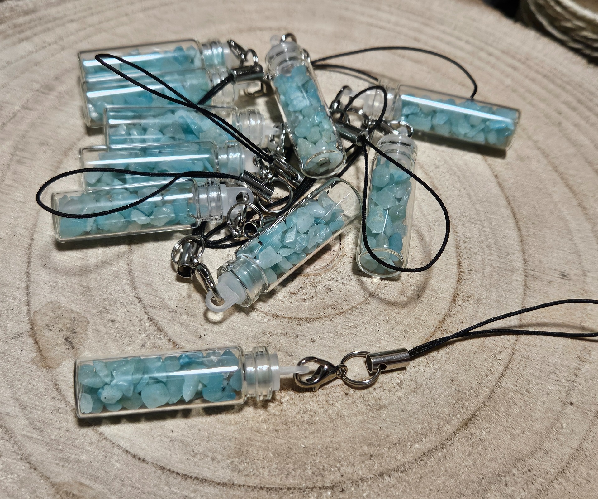 Táto očarujúca amazonitová fľaštička s úlomkami je ideálnou voľbou pre tých, ktorí chcú mať energiu odvahy a pokoja vždy pri sebe. V malej fľaštičke s dĺžkou približne 3,5 cm sú umiestnené jemne leštené amazonitové úlomky, ktoré vyžarujú vnútorný pokoj a harmóniu. Prívesok je dodávaný s krátkym remienkom s dĺžkou približne 7 cm, čo umožňuje pripevnenie na tašku, kľúče alebo mobilný telefón. Keďže je každý kus jedinečný, produkt sa posiela na základe náhodného výberu.
