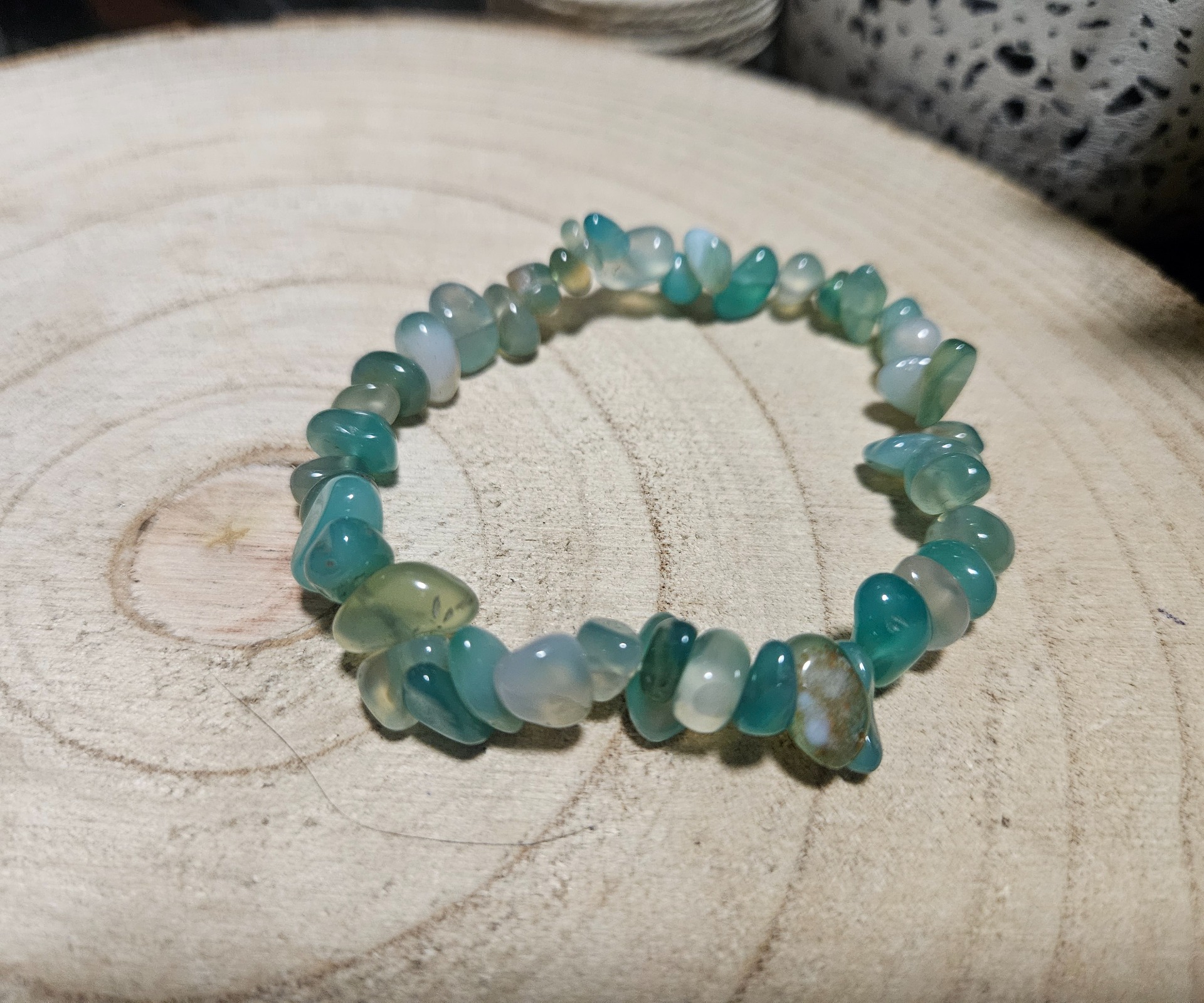 Tento ručne navlečený amazonitový náramok oslavuje pôvodnú, prirodzenú formu kameňa. Malé, leštené „úlomkové” korálky pôsobia rustikálnym, no príjemným dojmom a ukazujú upokojujúce, modrozelené odtiene amazonitu. Náramok je navlečený na elastickú šnúru, ktorá zaisťuje flexibilné a pohodlné nosenie na zápästí s obvodom 16-18 cm. Vďaka svojmu jedinečnému vzhľadu je skvelým doplnkom na každodenné nosenie, a rovnako ako každý prírodný kameň, aj tento je unikátny.