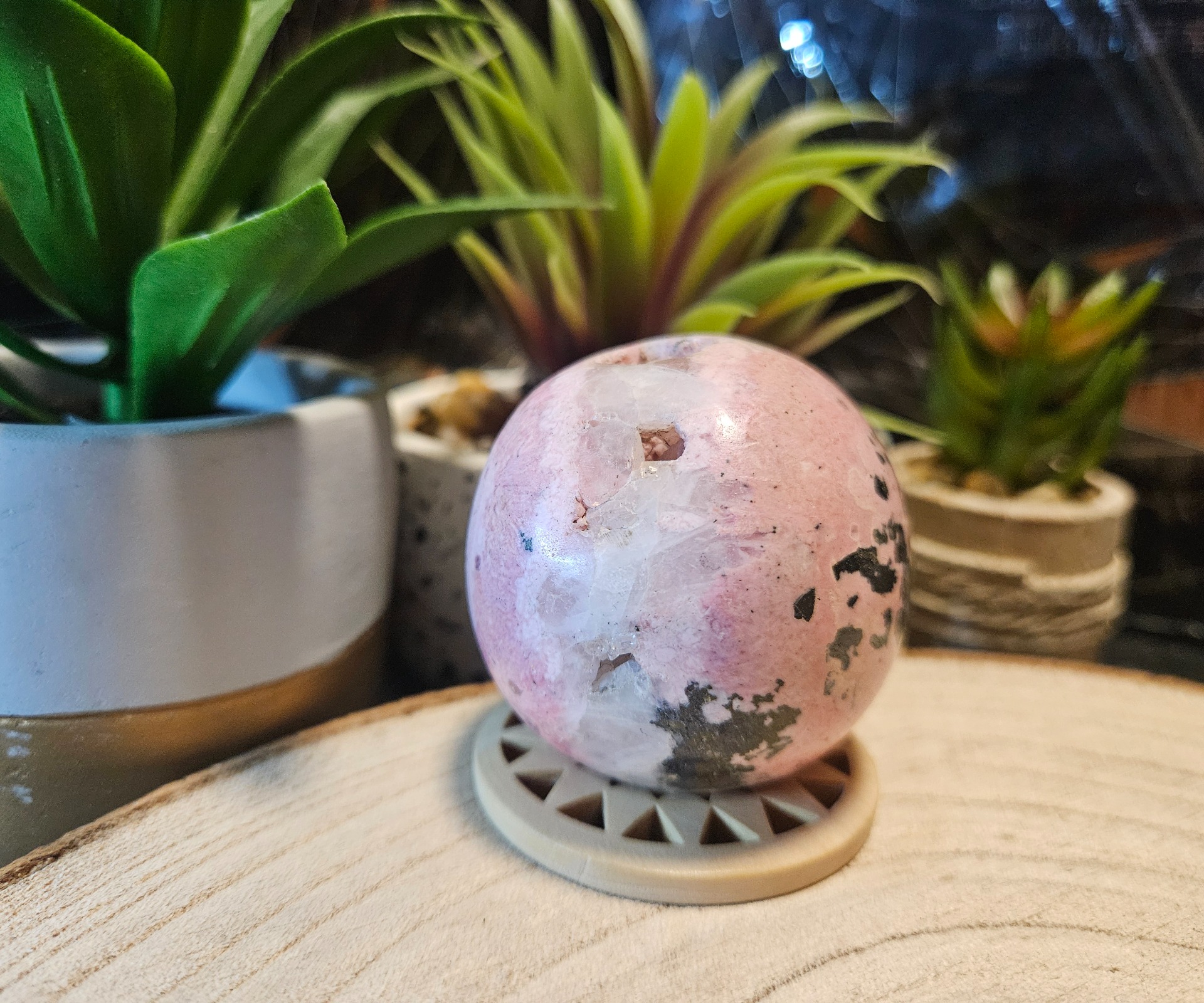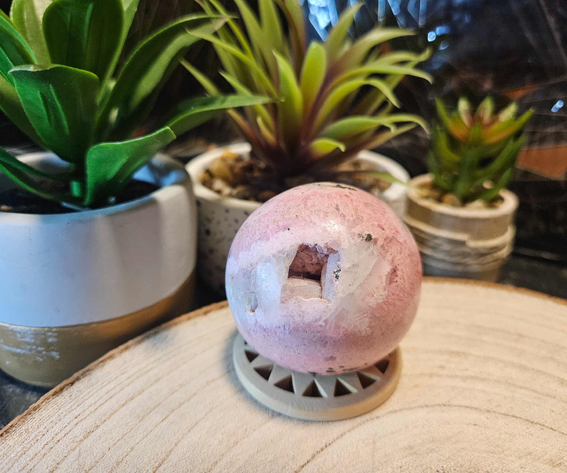 Táto Rodochrozitová guľa je stelesnením bezpodmienečnej lásky a dokonalosti. Jej hmotnosť je 241 gramov a jej krásny, hladký povrch narúša malý, kryštalický otvor – symbolizujúci bránu k tvojej vnútornej pravde. Používaj ju počas meditácie, umiestni si ju na Srdcovú čakru alebo ju maj v spálni na prúdenie energie lásky a nehy. Táto guľa ti pomôže odpustiť staré krivdy a byť k sebe nežná.