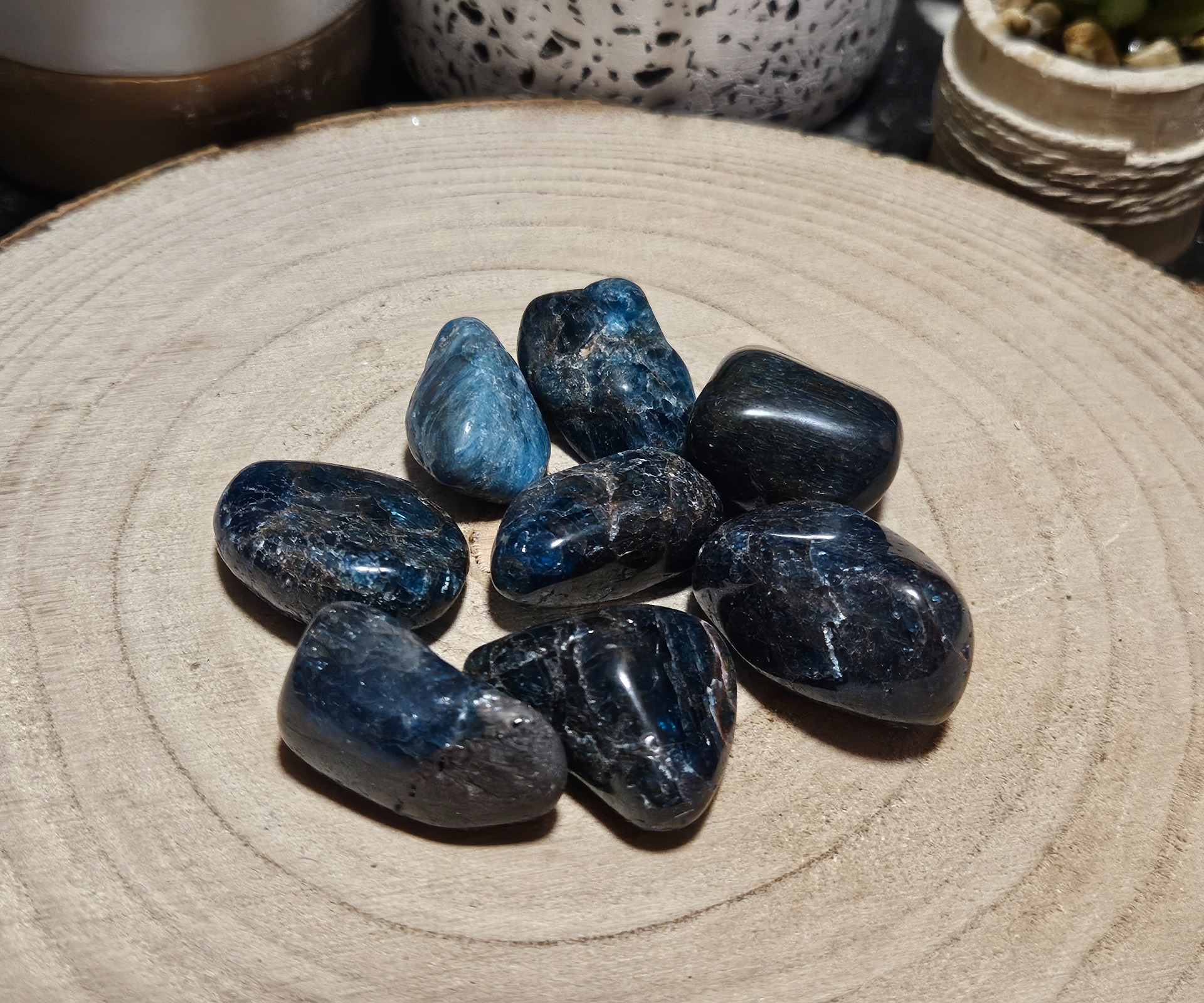 Tento hlboký, tmavomodrý Apatitový Hladený Kameň je hladký, leštený kus, ktorý sa pohodlne drží v dlani. Jeho veľkosť je približne 3 cm, vďaka čomu je vynikajúci na meditáciu alebo nosenie vo vrecku. Tmavé tóny kameňa zdôrazňujú silu duchovného prehĺbenia a vnútorného videnia. Tieto kusy sa predávajú jednotlivo.