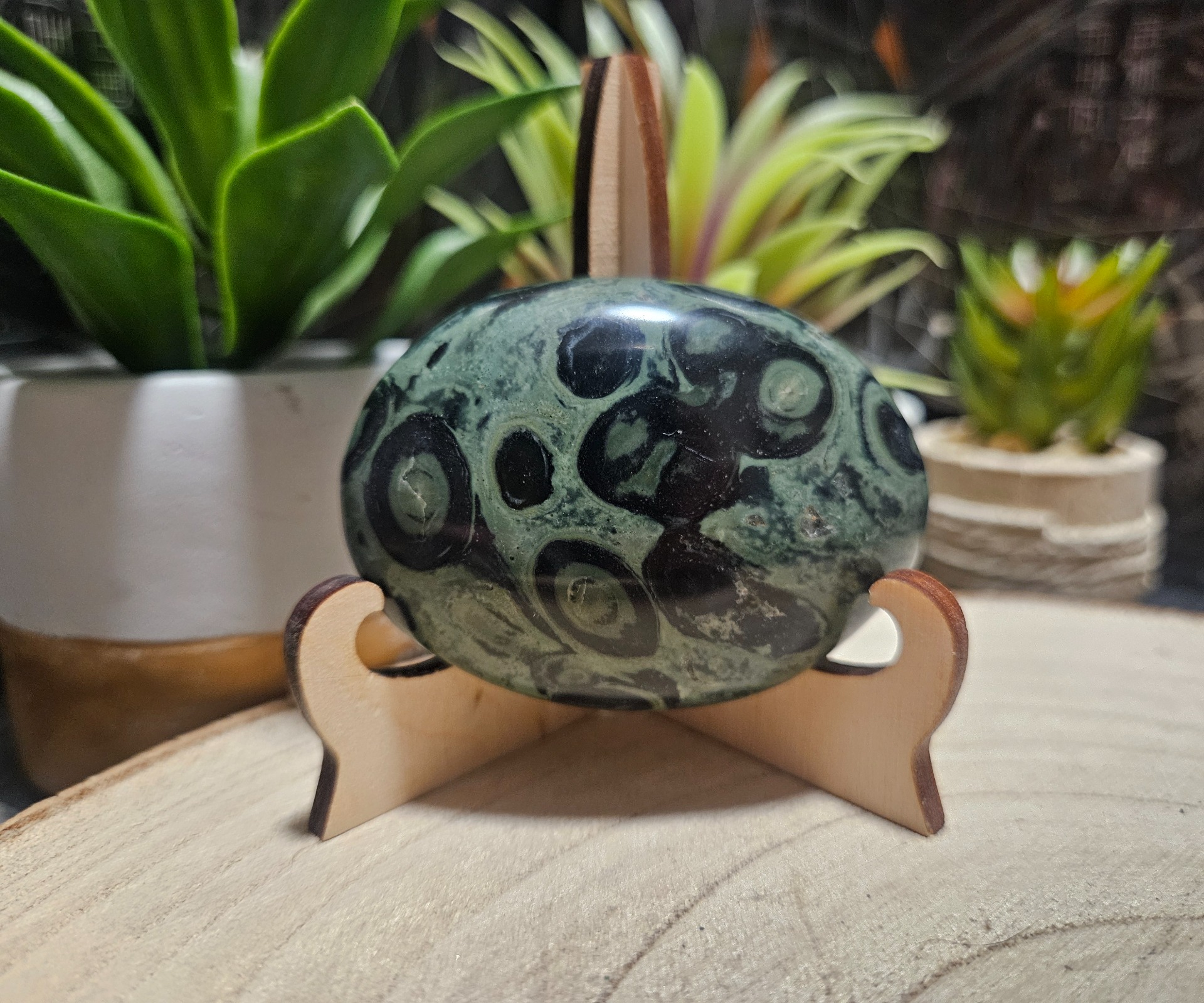 Kambaba jaspis je špeciálny kameň, často označovaný akokameň pokoja a mieru. Je to vzácny druh jaspisu, ktorý pochádza z nálezísk naMadagaskare a v Južnej Afrike. Jeho zelené a čierne vzory sú veľmicharakteristické a niekedy vytvárajú kruhové „oká” alebo vírivé tvary, preto saniekedy nazýva aj krokodílí jaspis alebo zelený stromatolitový jaspis. Jezaujímavé, že hoci má v názve slovo „jaspis”, geologicky je to vlastne typryolitu, ktorý obsahuje starobylé fosílne riasy (stromatolity) staré viac ako 3miliardy rokov, čo z neho robí jeden z najstarších kameňov na planéte.