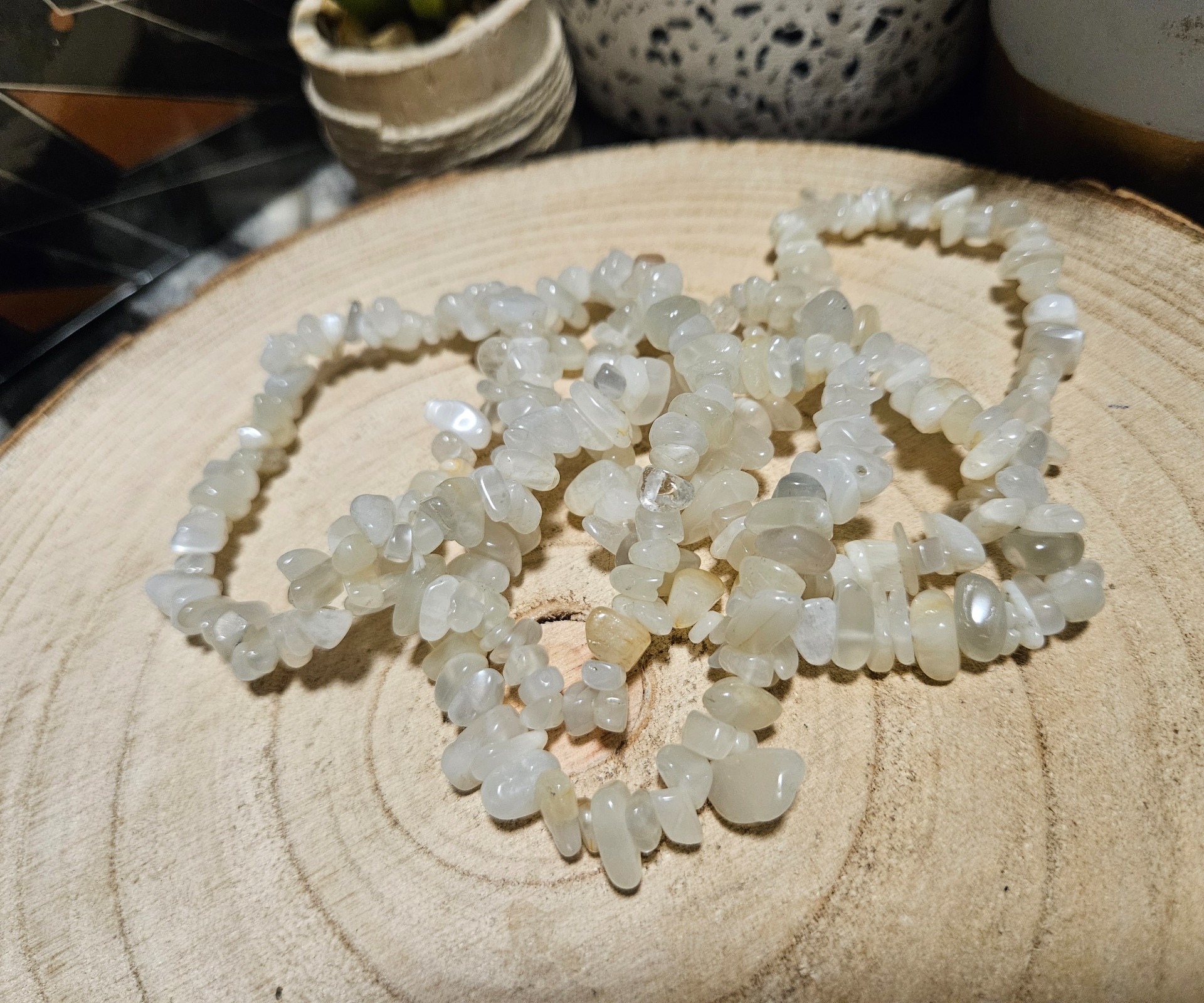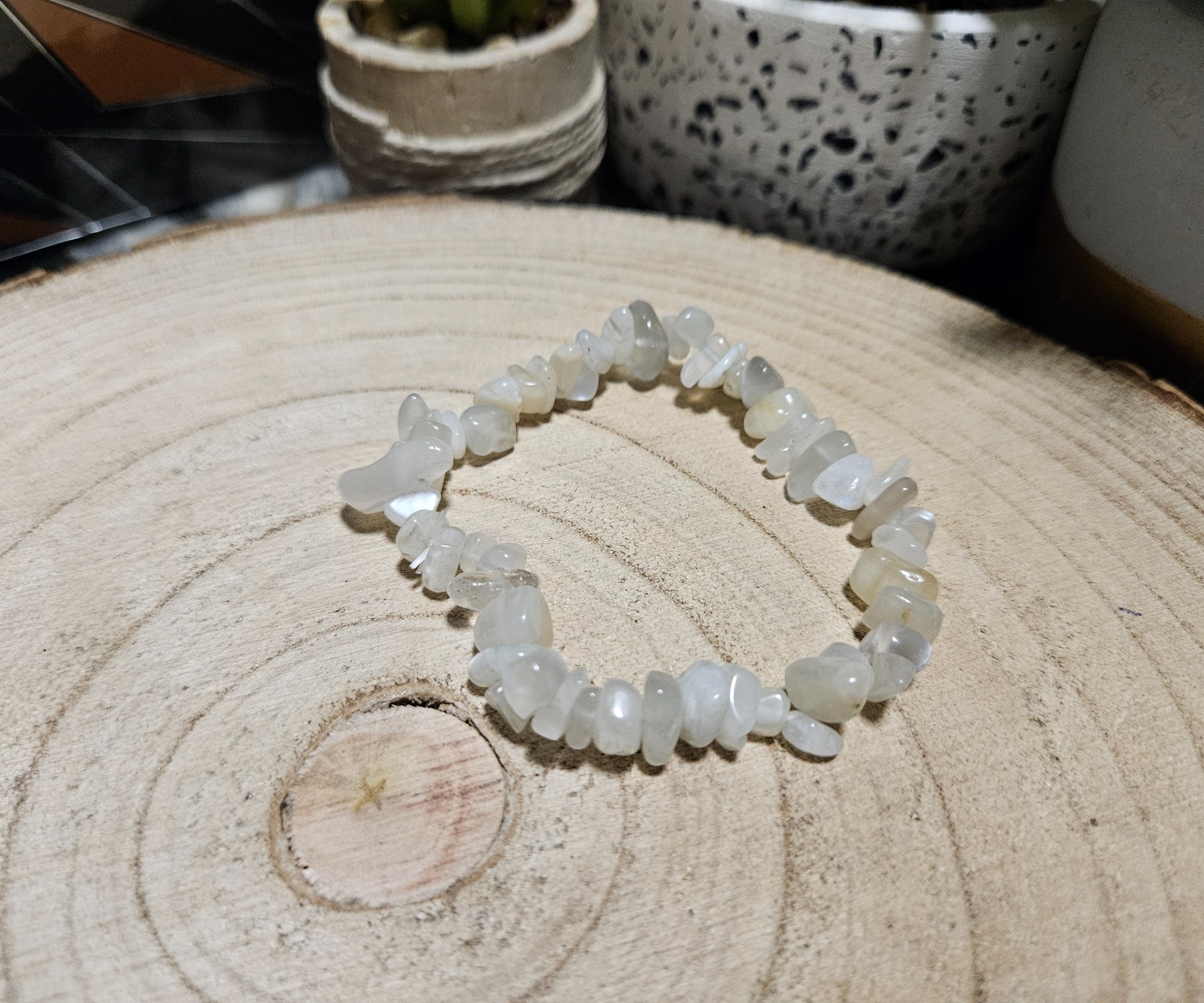 Zlomkový náramok z bieleho mesačného kameňa spája silu prírodných úlomkov kryštálov s jemnosťou ženských energií. Drobné kamene nepravidelného tvaru navlečené na pružnej gumičke zaisťujú pohodlné nosenie, pričom každý kus má jedinečnú hru svetla. Tento minerál pomáha pri vytváraní emocionálnej rovnováhy, zvyšuje intuíciu a podporuje vnútorný rast. Odporúča sa najmä v obdobiach nových začiatkov, pretože pomáha zladiť sa s obnovujúcou silou mesačných cyklov.