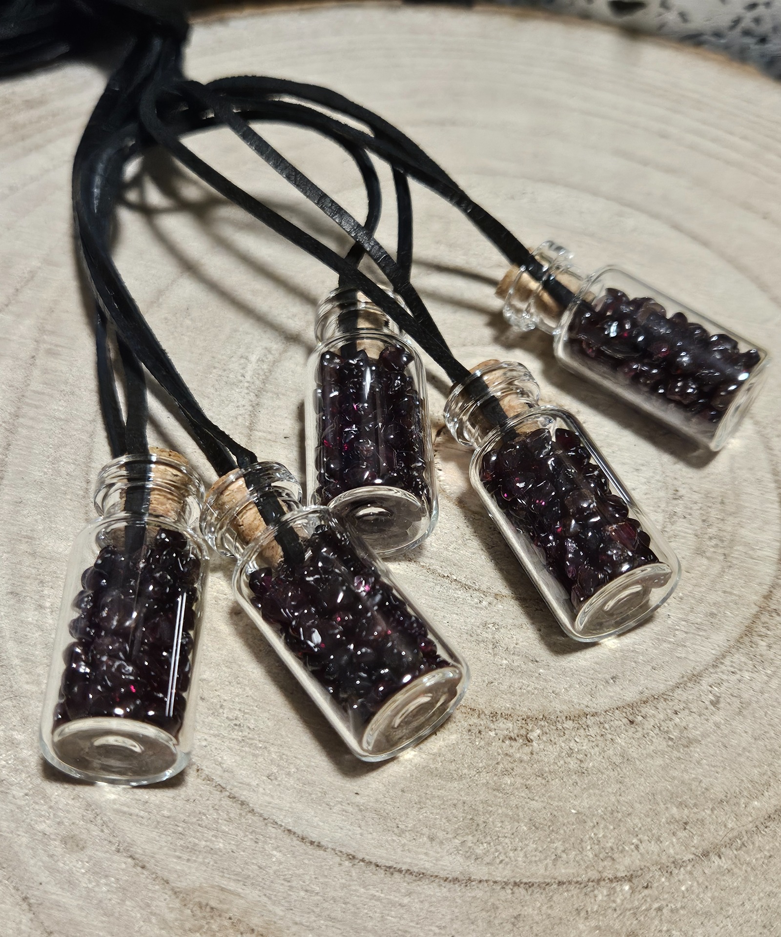 Tento originálny náhrdelník v sebe ukrýva surovú silu prírody ukrytú v malej sklenenej fľaštičke. Vnútro ampulky vypĺňajú drobné, brúsené kúsky pravého gránátu, ktoré žiaria sýtymi vínovočervenými odleskami. Fľaštička je bezpečne uzavretá prírodným korkovým uzáverom, čo šperku dodáva rustikálny a autentický vzhľad. Gránát je známy ako kameň životnej energie a odvahy, a v tejto podobe pôsobí ako osobný talizman, ktorý môžete mať stále pri sebe. Náhrdelník je zavesený na čiernej koženej šnúrke, ktorá podčiarkuje jeho prírodný charakter a zaručuje pohodlné nosenie počas celého dňa.