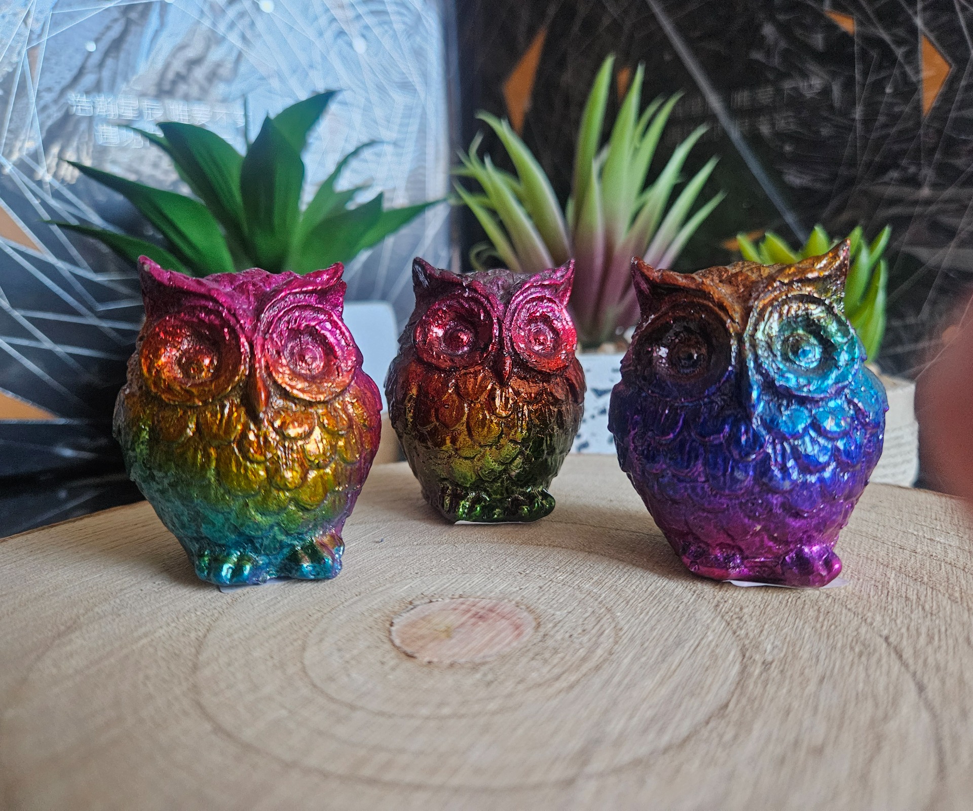 Figúrka sovy z imitácie bizmutu, stojaca, veľkosť cca. 4×5,5 cm, hmotnosť cca. 145 g.