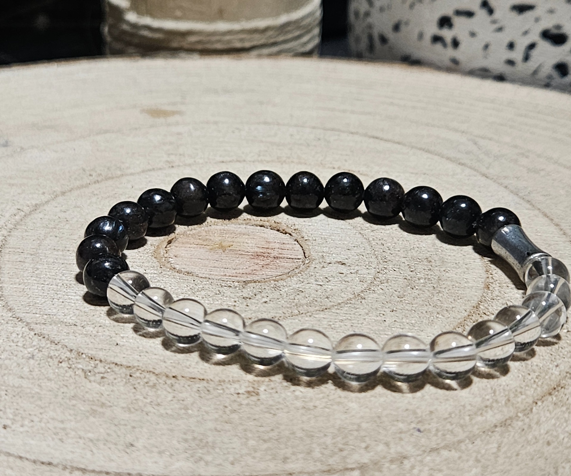 Horský krištáľ (Nositeľ svetla): V tejto kompozícii slúži na očistu a zosilnenie energií. Ako malý hranol zhromažďuje a vyžaruje liečivé vibrácie serafinitu.
