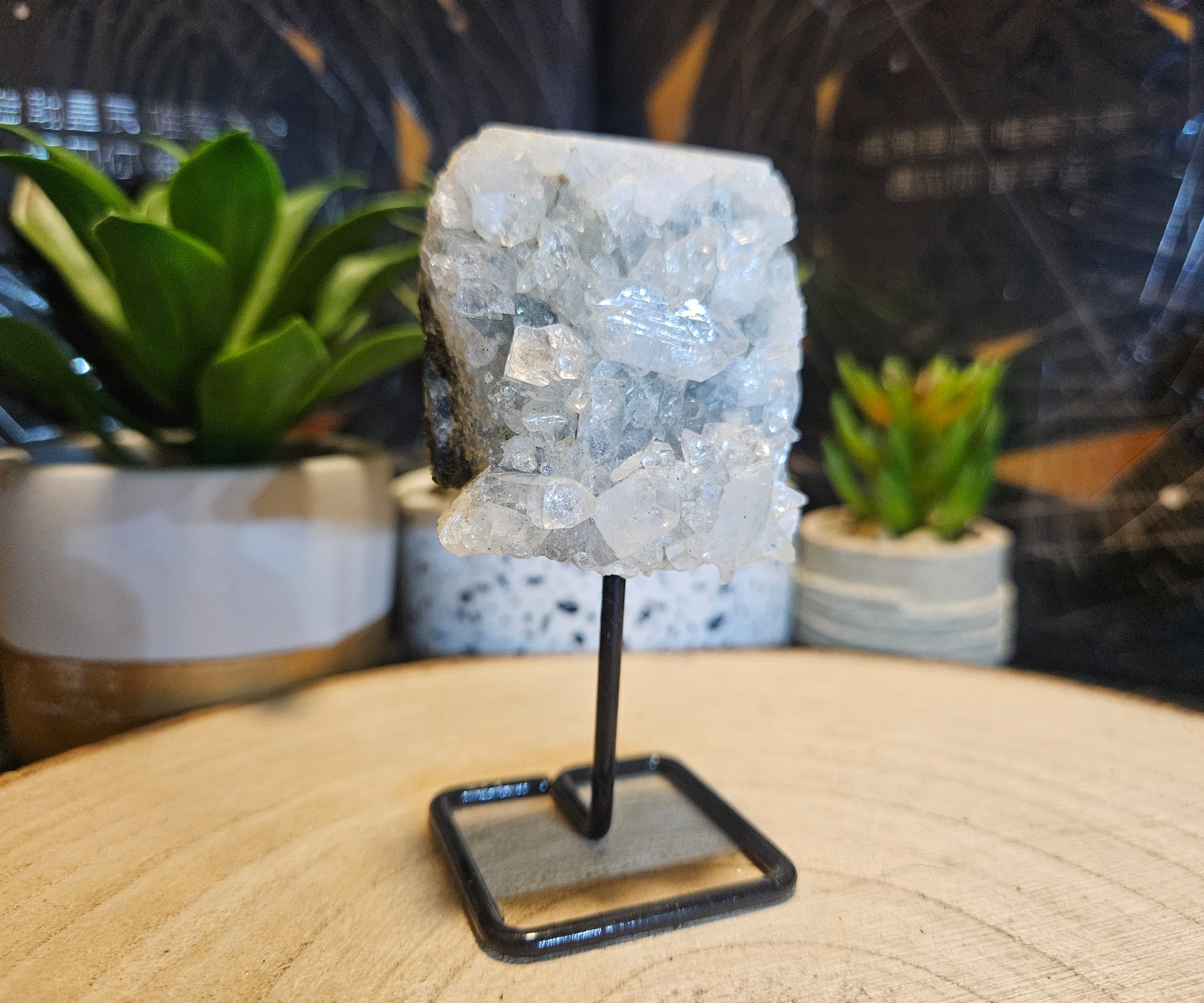 Minerál: Prírodný surový Apofylit. Konštrukcia: Čierny kovový stojan. Vyhotovenie: Unikátny produkt v štýle Imperial – zasielame konkrétny kus z fotografie.