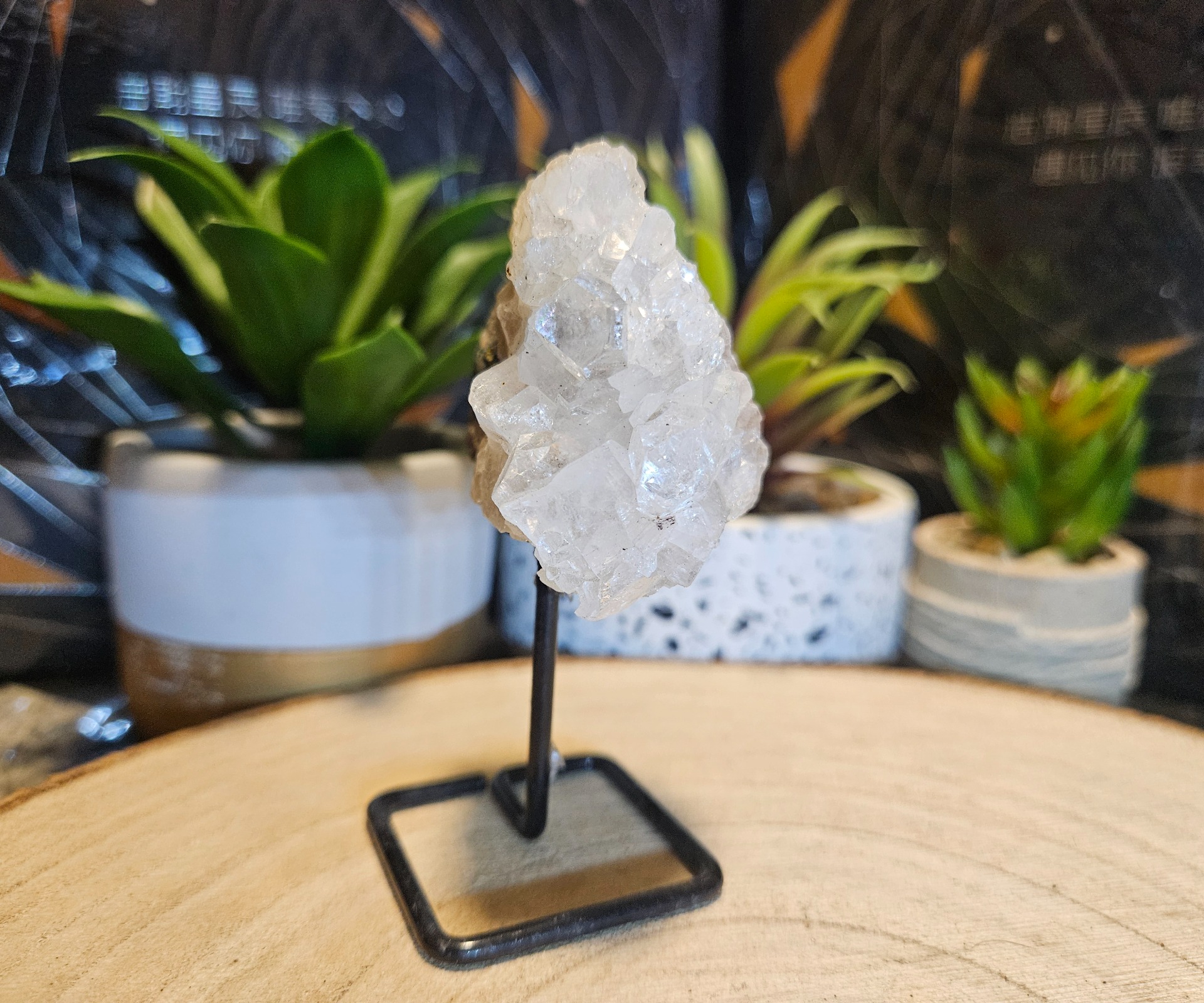 Minerál: Prírodný surový Apofylit. Konštrukcia: Čierny kovový stojan. Vyhotovenie: Unikátny produkt v štýle Imperial – zasielame konkrétny kus z fotografie.