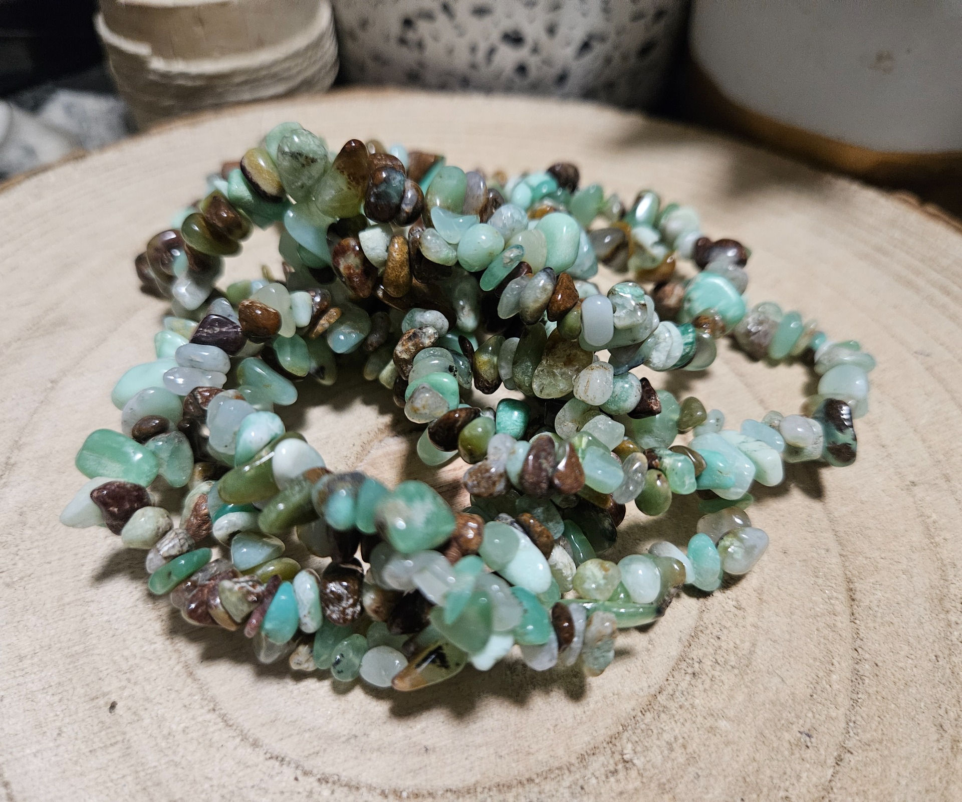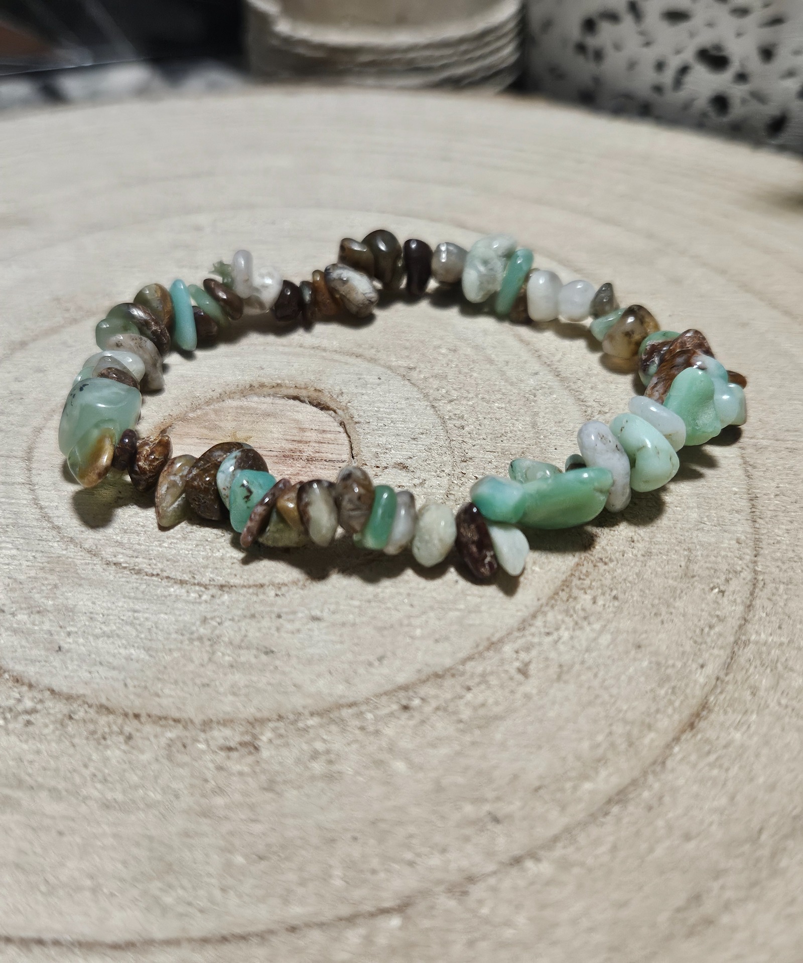 Tento náramok „Imperial Apple Bloom” je vyrobený z nepravidelných úlomkov (splitterov) prírodného chrizoprazu, ktoré si zachovávajú svoj surový, ale hladko opracovaný charakter. Farba kameňov prechádza od jemnej jablkovo-zelenej až po zemité hnedé tóny, čo vytvára prirodzený a organický vzhľad. Šperk je navlečený na kvalitnej elastickej gumičke s dĺžkou 16-18 cm, vďaka čomu sa dokonale prispôsobí zápästiu.