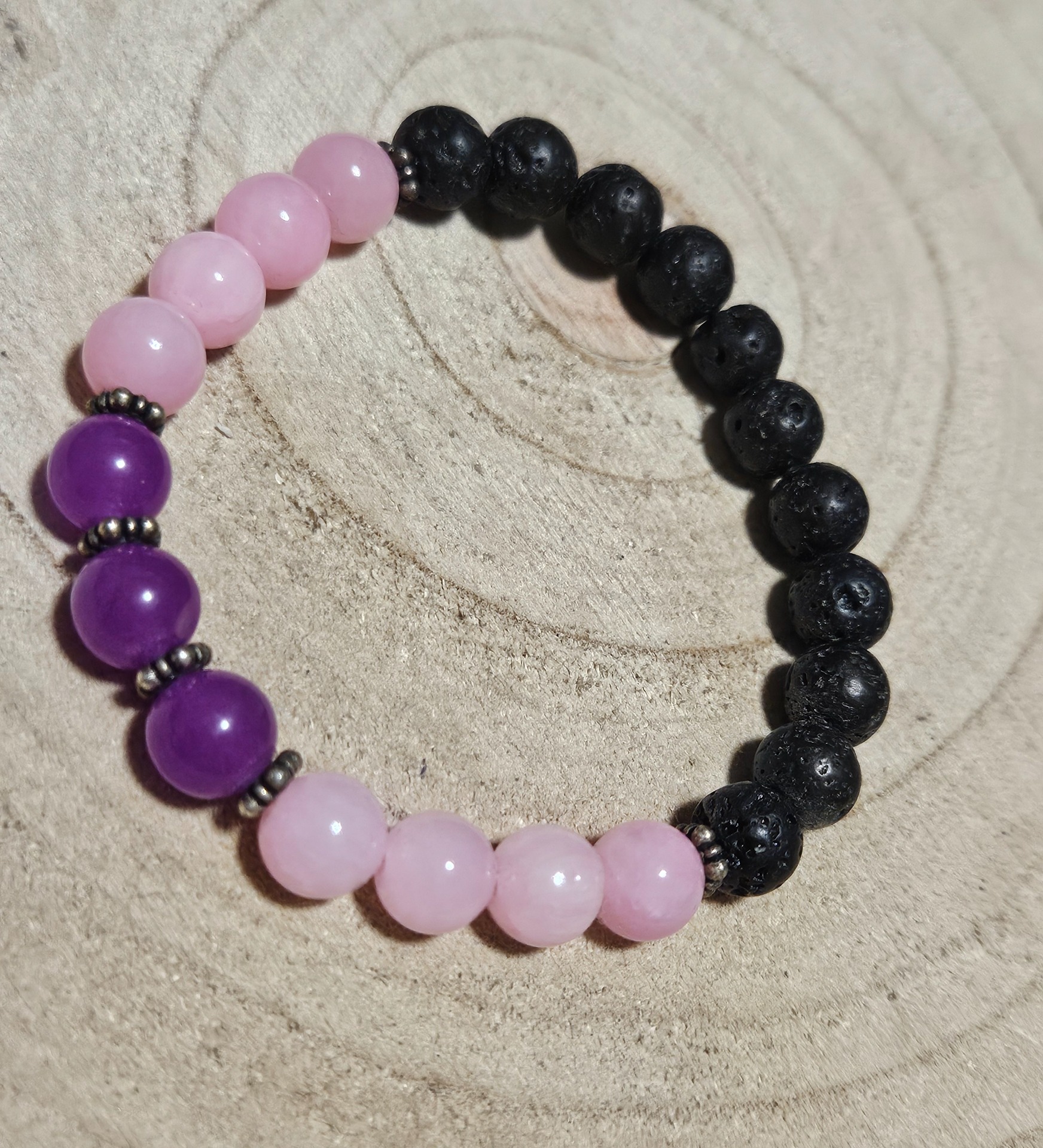 Nechajte sa očariť harmonickým spojením jemnosti a sily v tomto ručne vyrobenom náramku. Kombinácia pastelových odtieňov lila a ružového jadeitu s poréznym čiernym lávovým kameňom vytvára vizuálnu rovnováhu, ktorá vyžaruje pokoj aj stabilitu. Tento 8 mm náramok s dĺžkou 17-18 cm je ideálnym spoločníkom pre modernú ženu, ktorá hľadá duchovnú oporu v unikátnom dizajne.