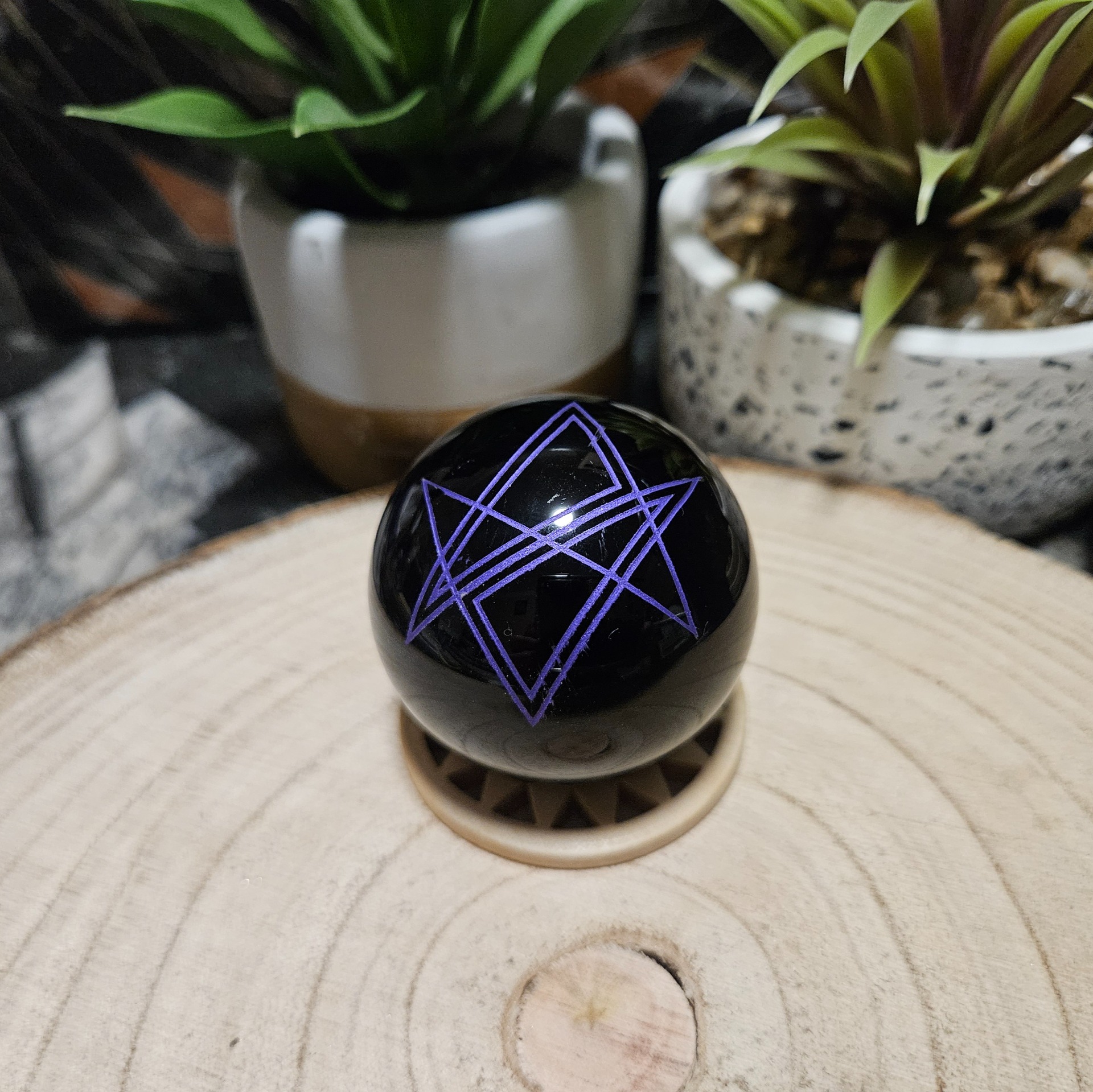 Objavte silu vesmírnej geometrie s touto unikátnou guľou z línie Imperial. Čierny obsidián, zrodený z hlbín zeme, nesie precízne gravírovaný fialový symbol hviezdy, ktorý slúži ako maják pre vašu dušu. Táto sféra je stvorená pre tých, ktorí hľadajú ochranu a jasné smerovanie na svojej spirituálnej ceste.