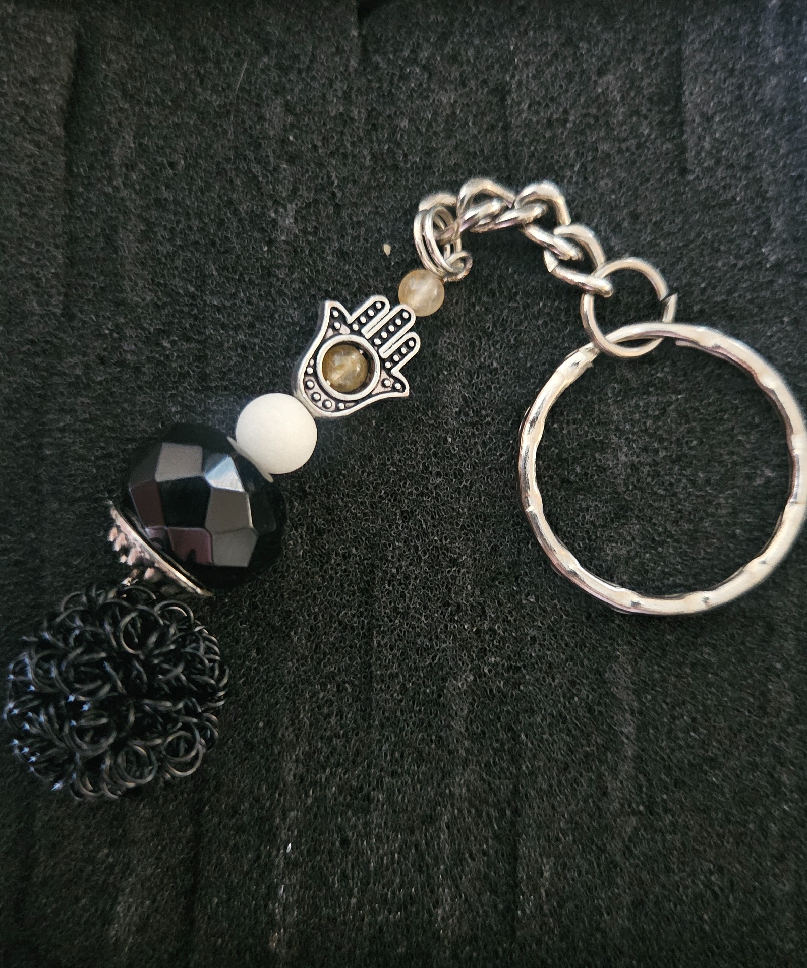 Tento unikátny, vlastnoručne vyrobený kúsok je vyvrcholením našej kolekcie. Kľúčenka „Imperial Hamsa” spája hlboký čierny onyx s hrejivým karneolom a harmonizujúcim jadeitom, pričom ústredným motívom je symbol Fatiminej ruky (Hamsa). Každý detail je výsledkom precíznej ručnej práce, čo z tohto doplnku robí osobný totem, ktorý vás chráni na každom kroku. Je to spojenie tradície a remesla, navrhnuté tak, aby vnášalo poriadok a ochranu do vášho každodenného života.