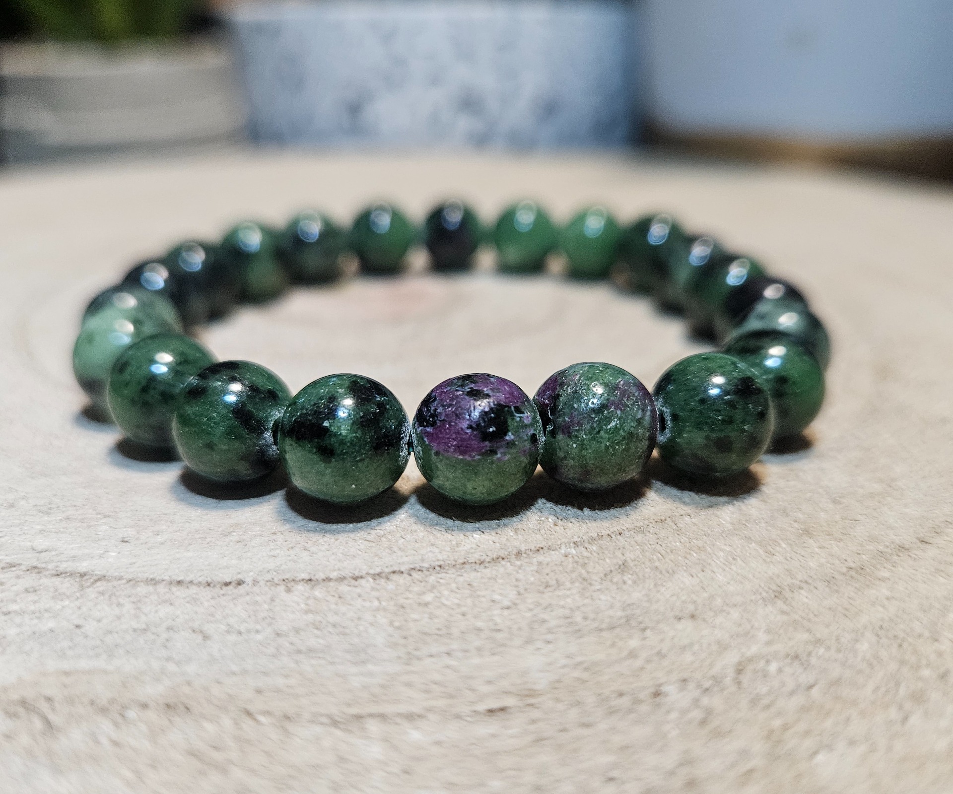Z hľadiska zdravia rubín v zoizite pôsobí ako silný regenerátor buniek a podporuje detoxikáciu organizmu. Pomáha pri problémoch s plodnosťou, harmonizuje funkciu pankreasu a posilňuje srdcový sval. Tento náramok je ideálnym spoločníkom pri zotavovaní sa z chorôb, pretože dodáva telu potrebnú vitalitu a energiu.