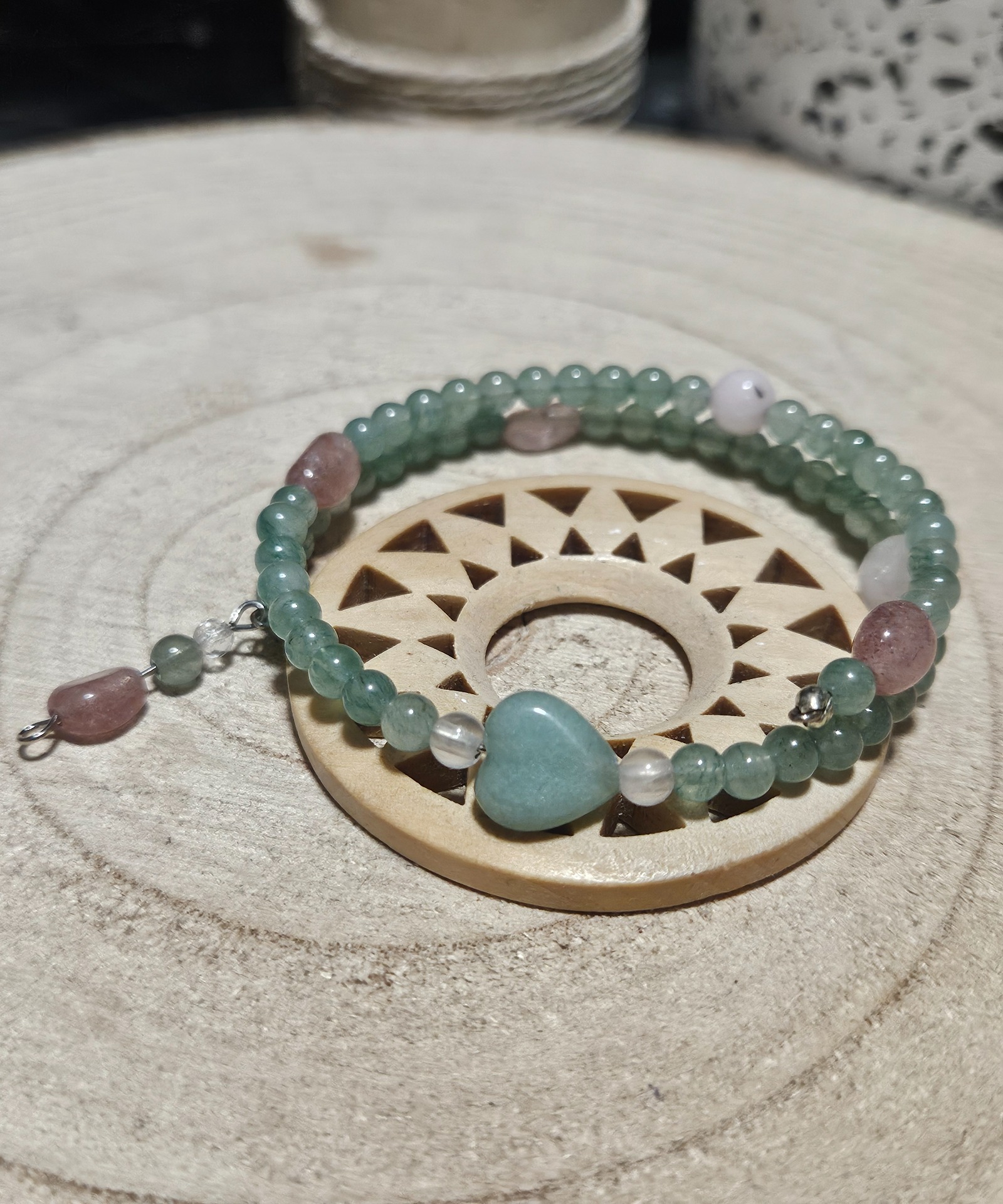 Tento ručne vyrobený viacradový náramok „Imperial Infinite Blossom” je skutočným unikátom, z ktorého existuje len jeden jediný kus. Je postavený na pevnom pamäťovom drôte, ktorý si zachováva svoj dokonalý tvar a zaručuje stabilitu šperku. Základ tvorí jemný zelený aventurín, ktorý je harmonicky doplnený o ruženín, jahodový kremeň a číry krištáľ. Dominantným prvkom je centrálna korálka v tvare srdca z aventurínu. Vďaka dĺžke 16-17 cm a flexibilnému drôtu náramok krásne obopne zápästie a pôsobí ako bohatý, vrstvený šperk.