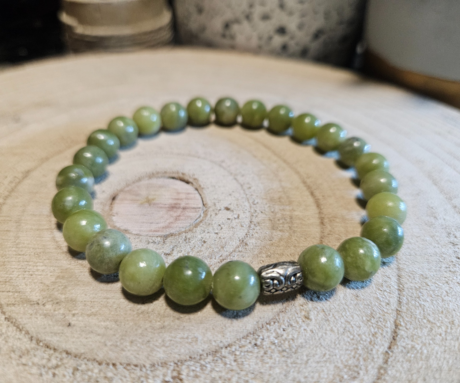 Dovoľte, aby do vášho života vstúpila harmónia s týmto výnimočným, ručne vyrobeným šperkom. 8 mm jadeitové guličky s hodvábnym leskom nesú starobylú energiu vnútorného pokoja a šťastia. Jemná kvetinová ozdoba zdobiaca náramok je symbolom obnovy a rozkvetu ženskej energie. Toto 20 cm pružné prevedenie zaisťuje pohodlné nosenie, pričom pri každom pohybe vyžaruje pokoj prírody. Handmade výtvor, ktorý podporuje rozkvet duše.