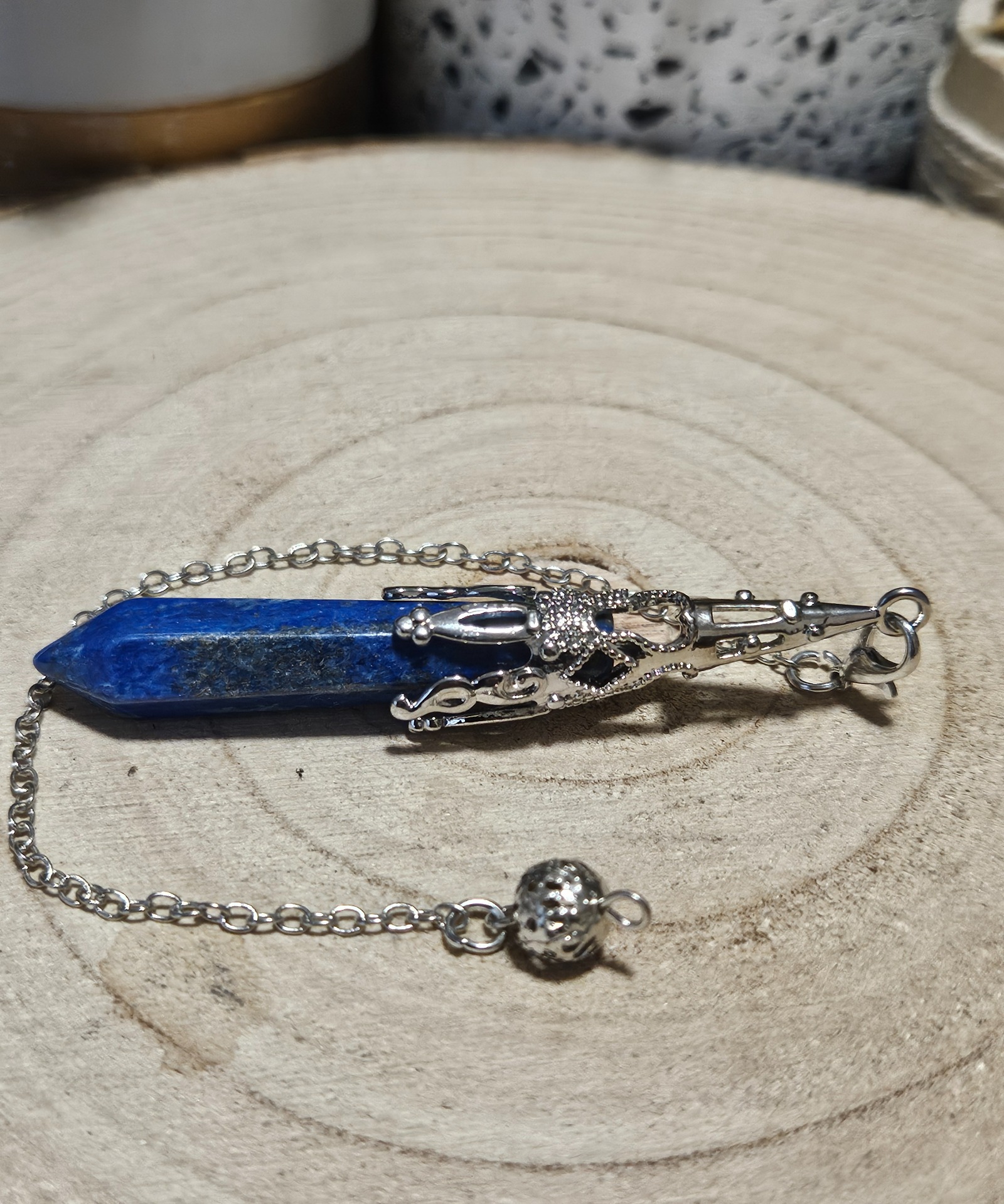Minerál je prírodný lapis lazuli v tvare hrotu. Typ produktu je veštecké kyvadlo s kovovou korunkou a retiazkou zakončenou guľôčkou. Rozmery hrotu sú približne 10×50 mm. Je vhodný na radiestéziu, hlbokú meditáciu a diagnostiku čakier. Pre zachovanie presnosti odporúčame kyvadlo pravidelne čistiť dymom zo šalvie a uchovávať ho na selenitovej podložke, aby bolo vždy pripravené na prácu.
