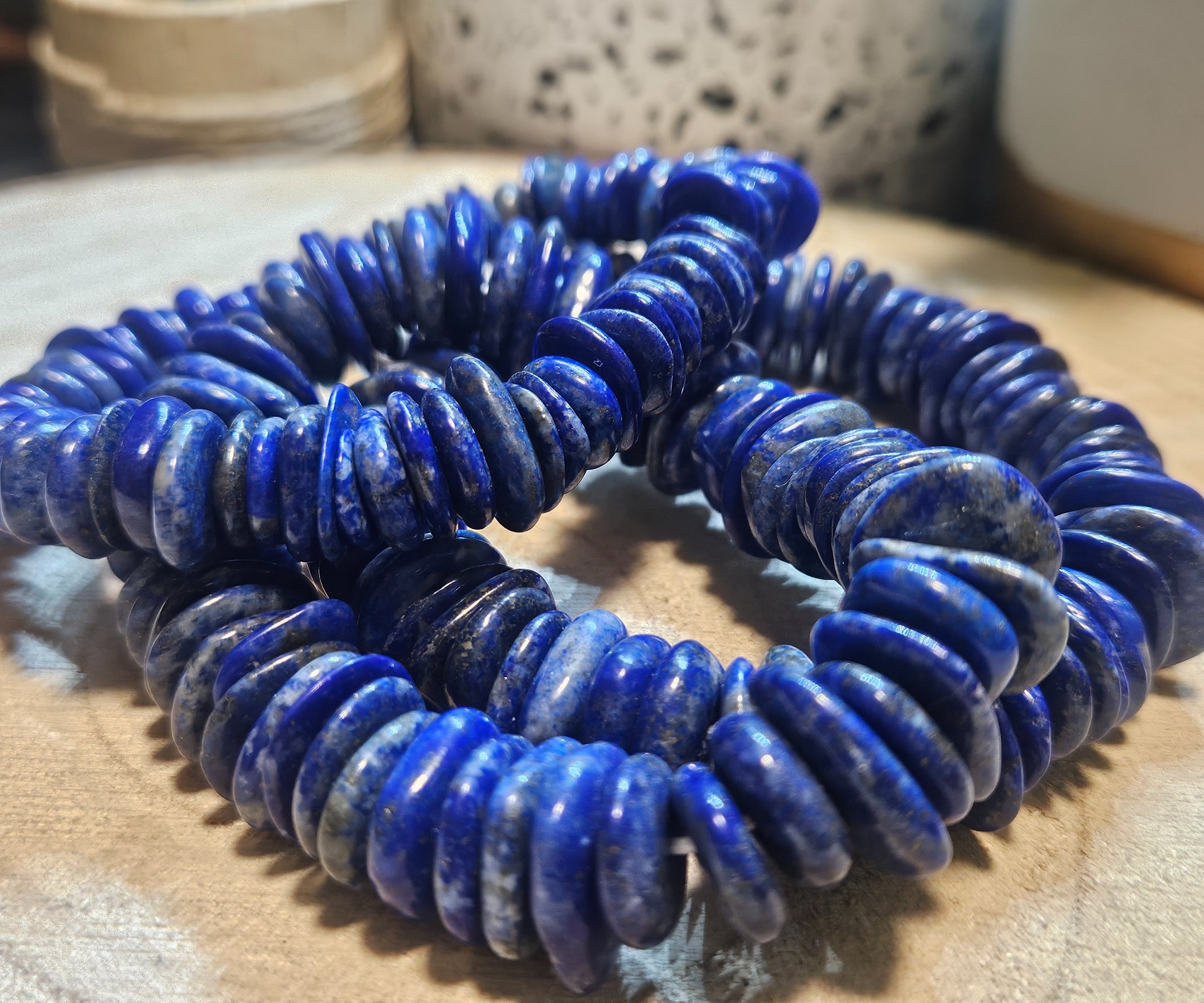 Tento náramok je vytvorený z veľkých, ručne leštených plochých šošoviek prírodného lapisu lazuli, ktoré svojím tvarom pripomínajú staroveké talizmany. Masívne korálky v tvare diskov nechávajú vyniknúť hlbokej kráľovskej modrej farbe s prirodzenými inklúziami piritu a kalcitu. Vďaka navlečeniu na kvalitnej pružnej gumičke (17-22 cm) sa náramok prispôsobí širšiemu spektru zápästí a pôsobí na ruke veľmi dominantne a luxusne. Je to šperk pre tých, ktorí hľadajú spojenie histórie, sily a výrazného dizajnu.