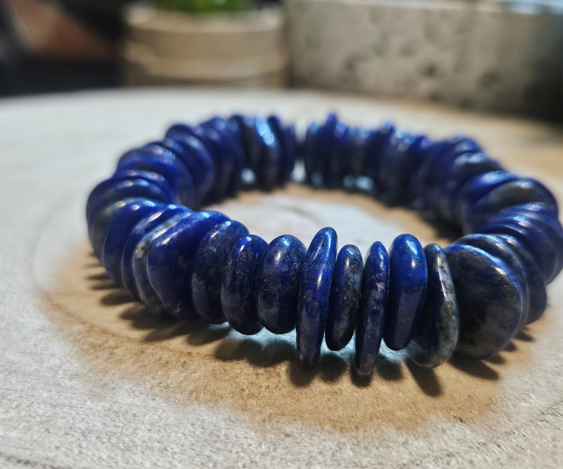 Minerál je prírodný lapis lazuli v tvare veľkých plochých šošoviek (oválne/okrúhle disky). Typ šperku je masívny energetický náramok na odolnej pružnej gumičke. Dĺžka náramku je v rozmedzí 17-22 cm. Je vhodný pre každého, kto preferuje výrazné a ťažšie minerálne šperky. Odporúčame čistiť suchou cestou (dymom alebo na selenitovom kotúči) a nabíjať počas mesačnej noci.