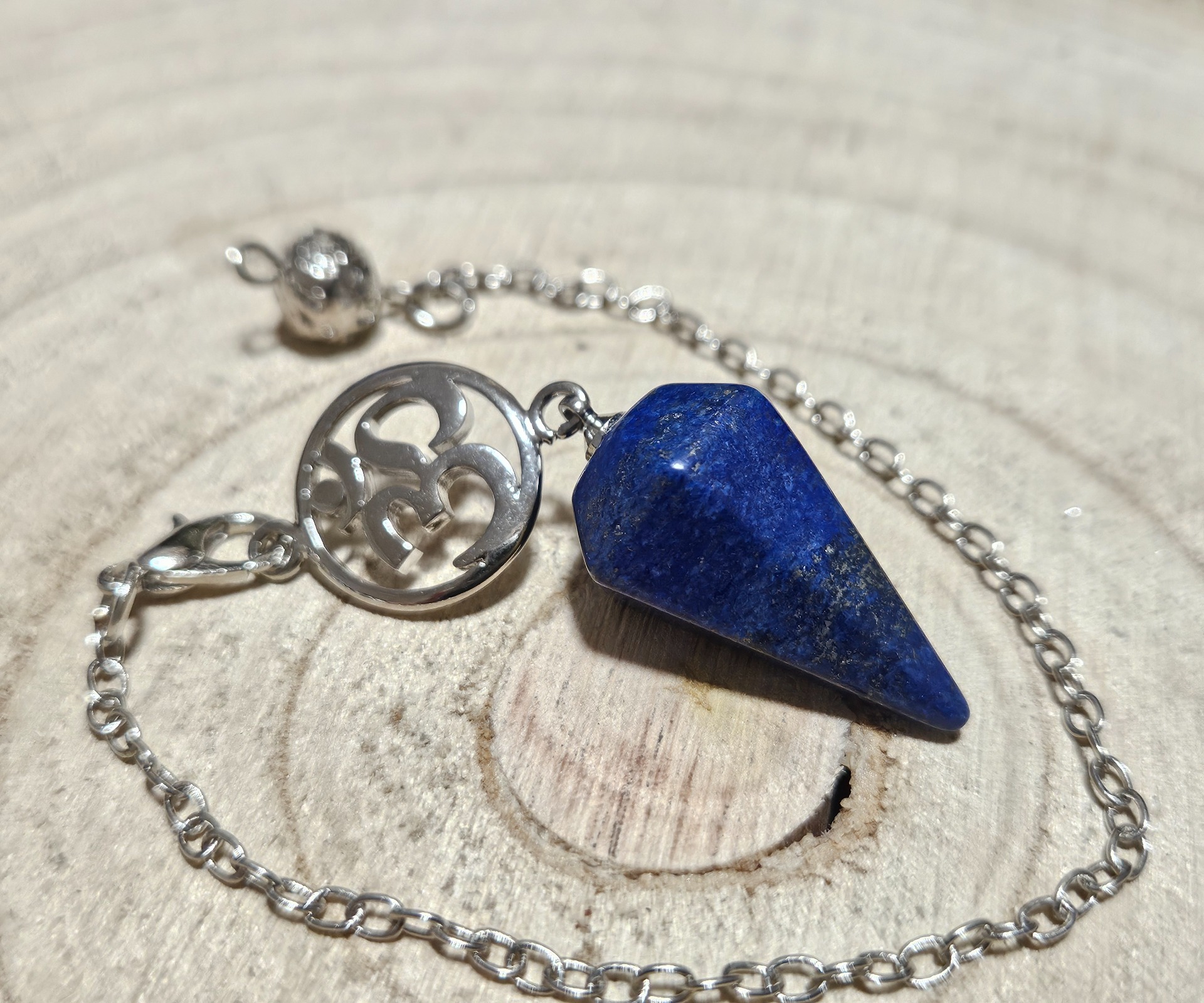 Minerál je prírodný lapis lazuli vybrúsený do šesťbokého hrotu. Typ produktu je veštecké kyvadlo s kovovou ozdobou v tvare Om a loptičkou na konci retiazky. Rozmery hrotu sú 1,5×2,5 cm. Je vhodné na jemnú radiestéziu, meditáciu a harmonizáciu. Odporúčame ho pravidelne čistiť na selenitovom kotúči, aby si zachovalo svoju citlivosť na jemnohmotné energie.