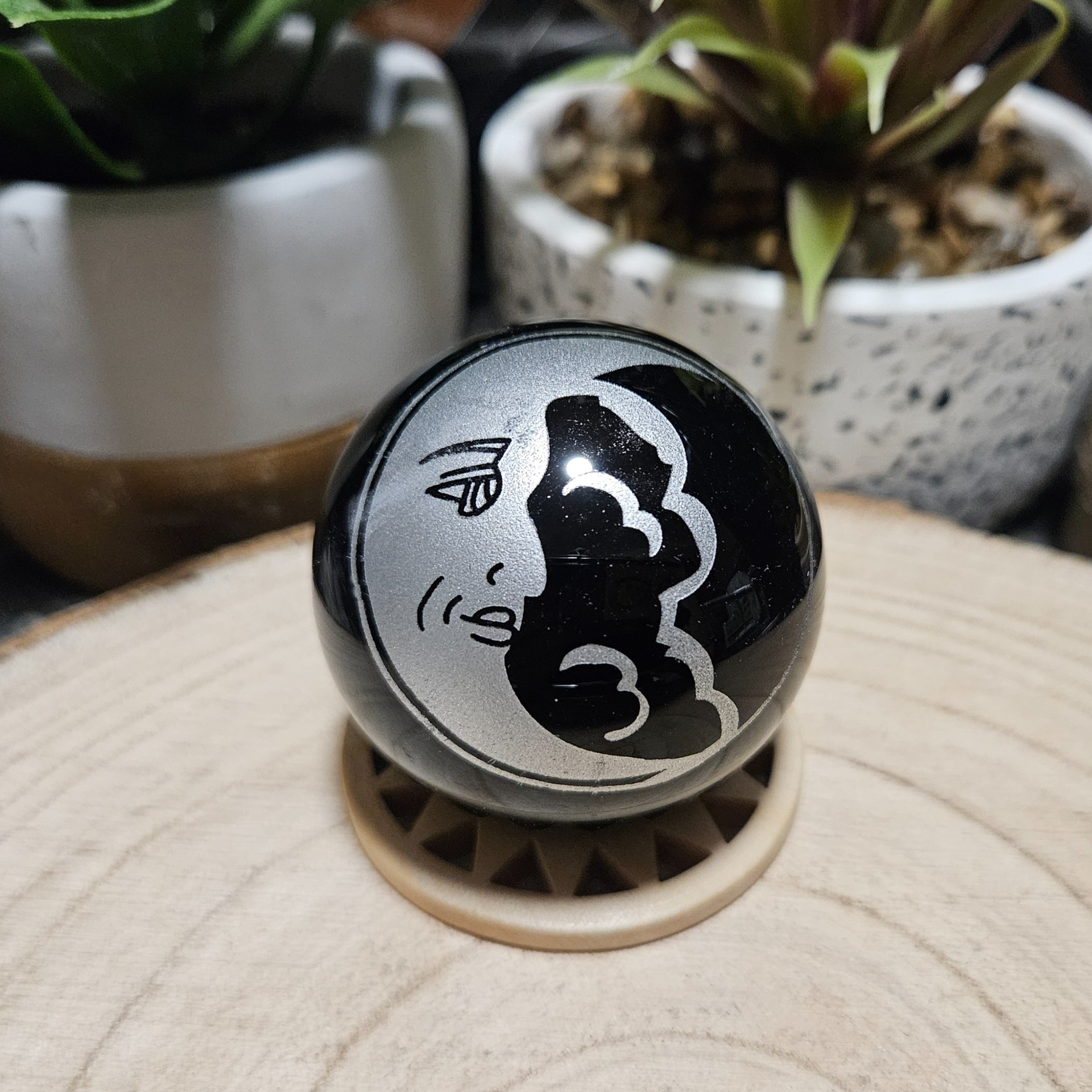 Mesiac na čiernom podklade bol odpradávna symbolom ženskej energie a ochrany počas noci. Táto 5 cm guľa je nielen silným energetickým nástrojom, ale aj elegantným doplnkom. Najlepšie vynikne na drevenom alebo kovovom stojane na mieste, kde radi odpočívate.