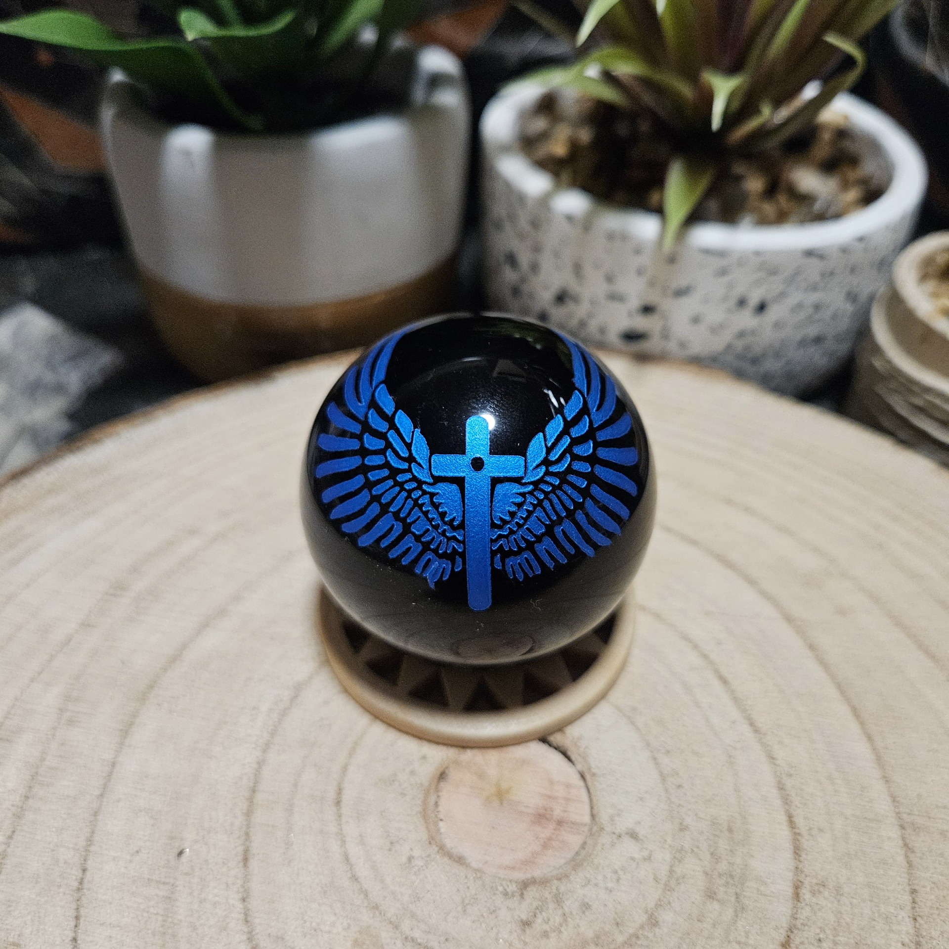 Nájdite pokoj pod krídlami nebeských strážcov s touto unikátnou guľou z línie Imperial. Čierny obsidián, zrkadlo pravdy, nesie žiarivo modré gravírovanie kríža lemovaného anjelskými krídlami. Tento symbol predstavuje božský zásah, nádej a neochvejnú ochranu na vašej životnej ceste.