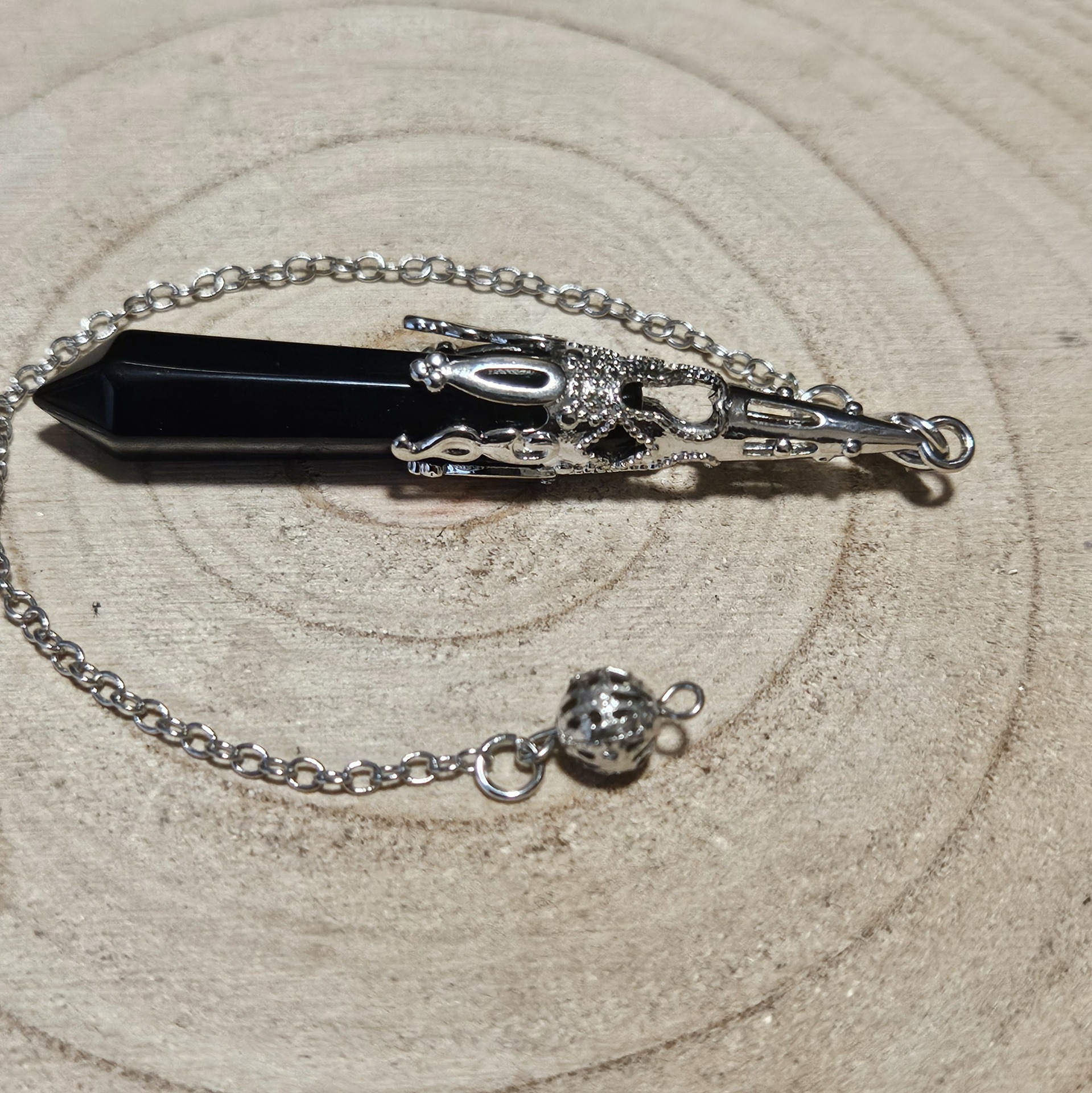 Hľadáš jasné odpovede v neistých časoch? Toto kyvadlo z línie Imperial ti ich pomôže nájsť. Ručne opracovaný čierny obsidián v tvare hrotu je osadený v detailne prepracovanej kovovej korunke, ktorá symbolizuje autoritu nad vlastným osudom. Jeho váha a vyváženosť zaisťujú dokonalú citlivosť na jemné energetické vibrácie, zatiaľ čo kovová guľôčka na konci reťaze ti umožní pevný úchop pri každom rituáli.