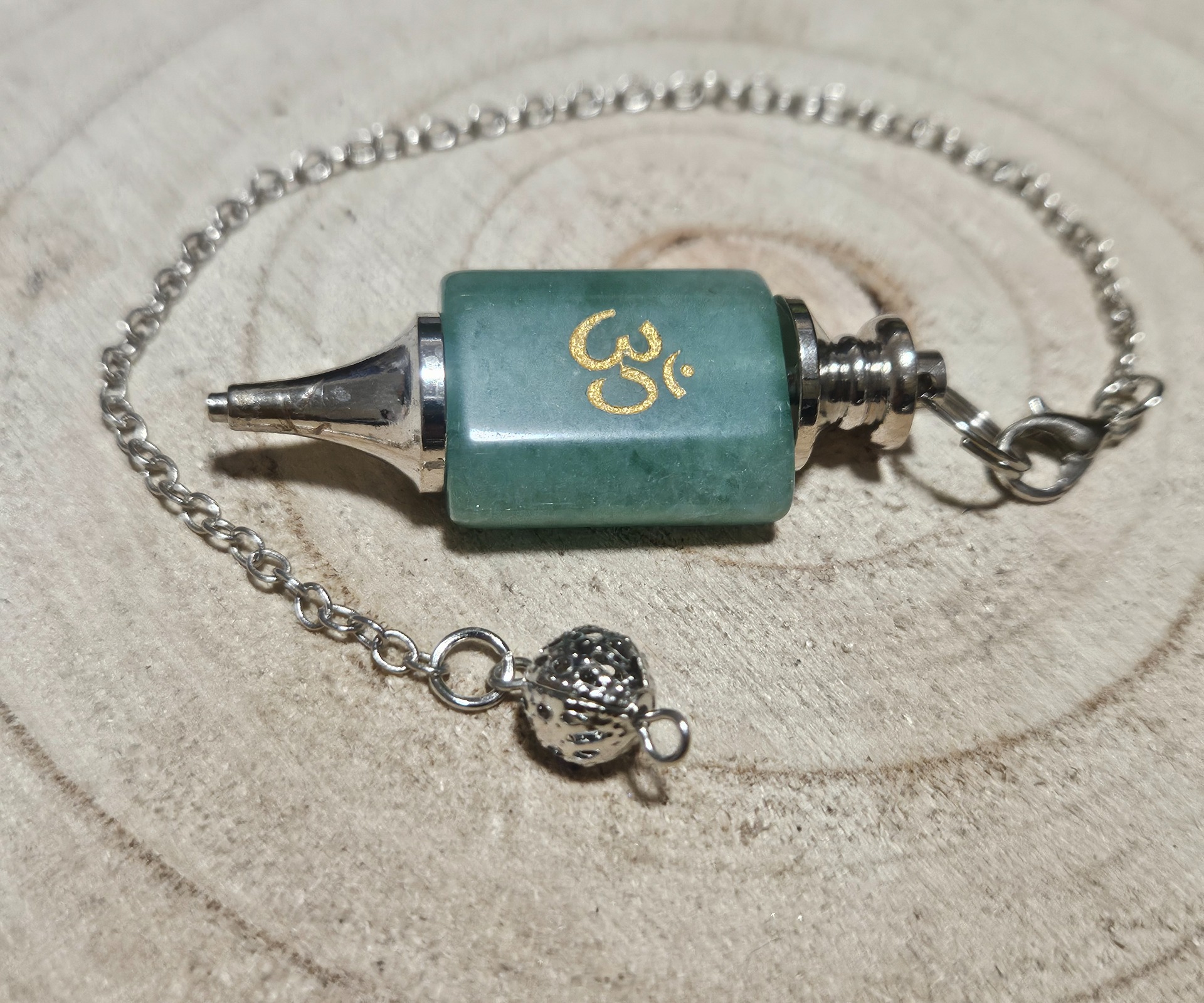 Toto unikátne kyvadlo „Imperial Om Oracle” s rozmermi 1,8 x 5 cm je vyrobené z masívneho kusu prírodného zeleného aventurínu v tvare tehličky. Na prednej strane kameňa je vyobrazený posvätný symbol „Óm” v žiarivej zlatej farbe, ktorý symbolizuje prvotný zvuk vesmíru. Kyvadlo je zakončené špicatým kovovým hrotom striebornej farby pre presné zacielenie a je zavesené na jemnej retiazke, ktorá končí ozdobnou kovovou korálkou.