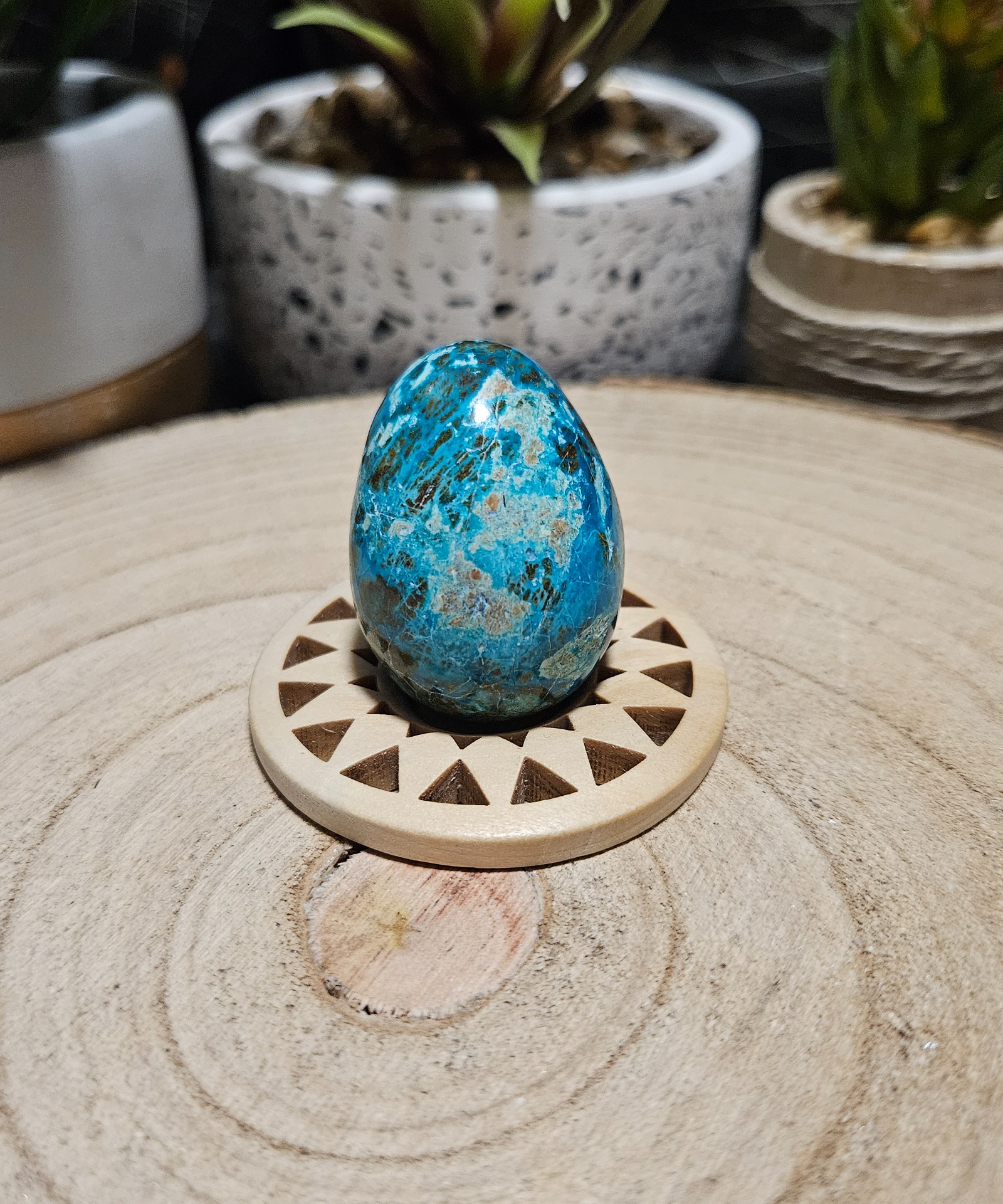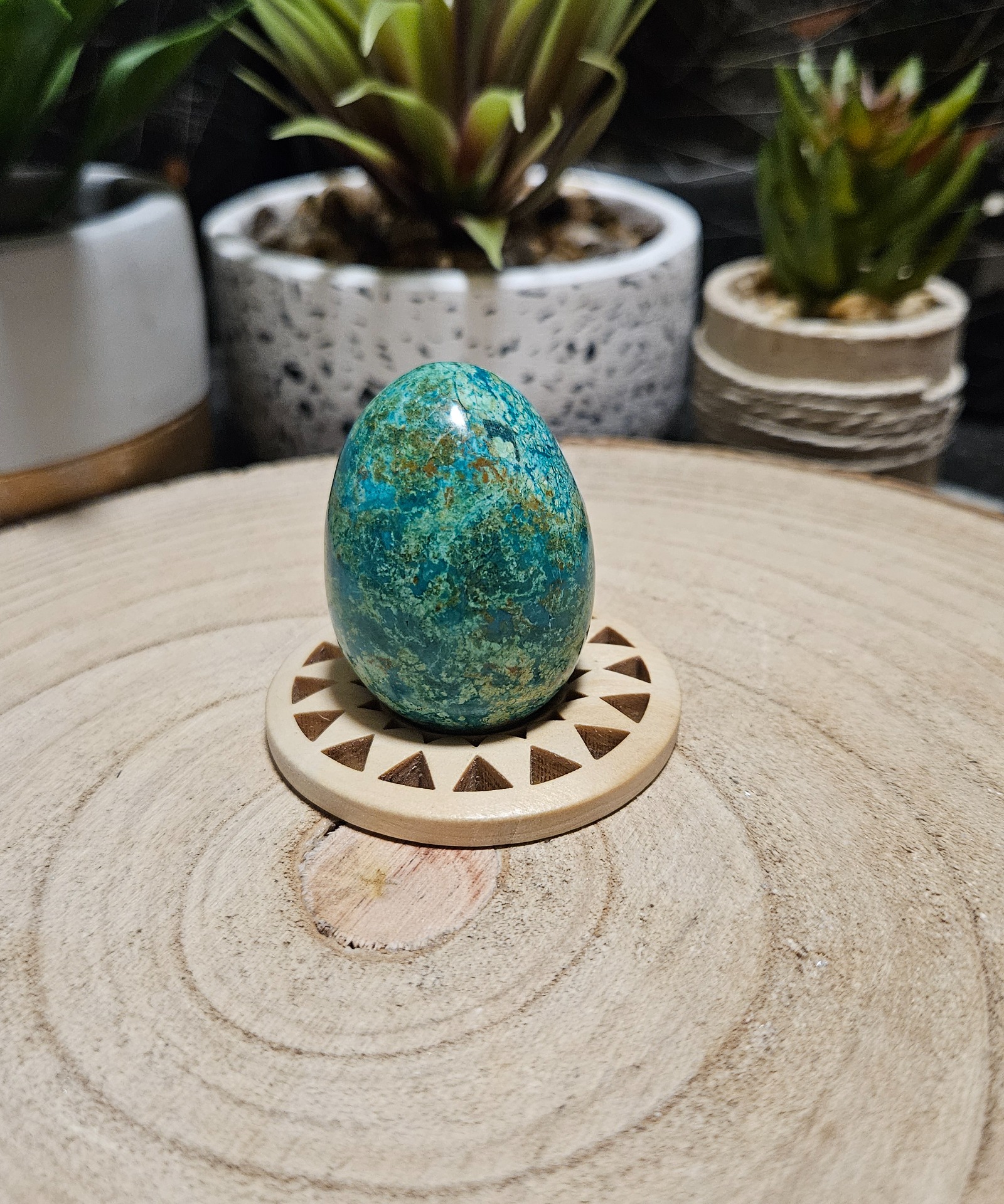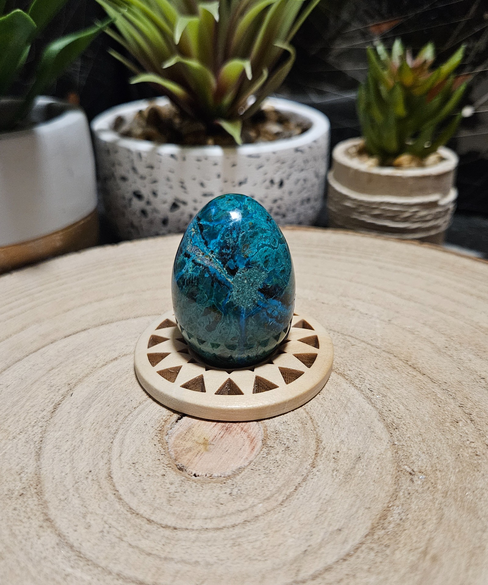 Tieto nádherné brúsené vajíčka sú vyrobené z vysoko kvalitného chryzokolu pochádzajúceho z nálezísk v Peru. Každý kus meria približne 3,5 až 4,5 cm a vyznačuje sa fascinujúcou kresbou pripomínajúcou mapu oceánov a kontinentov. Farby prechádzajú od sýtej tyrkysovej až po smaragdovo zelenú, často s prímesou tmavých minerálov v matrici. Výber konkrétneho kusu prebieha náhodne, čo zaručuje, že dostanete originálny kúsok prírody.