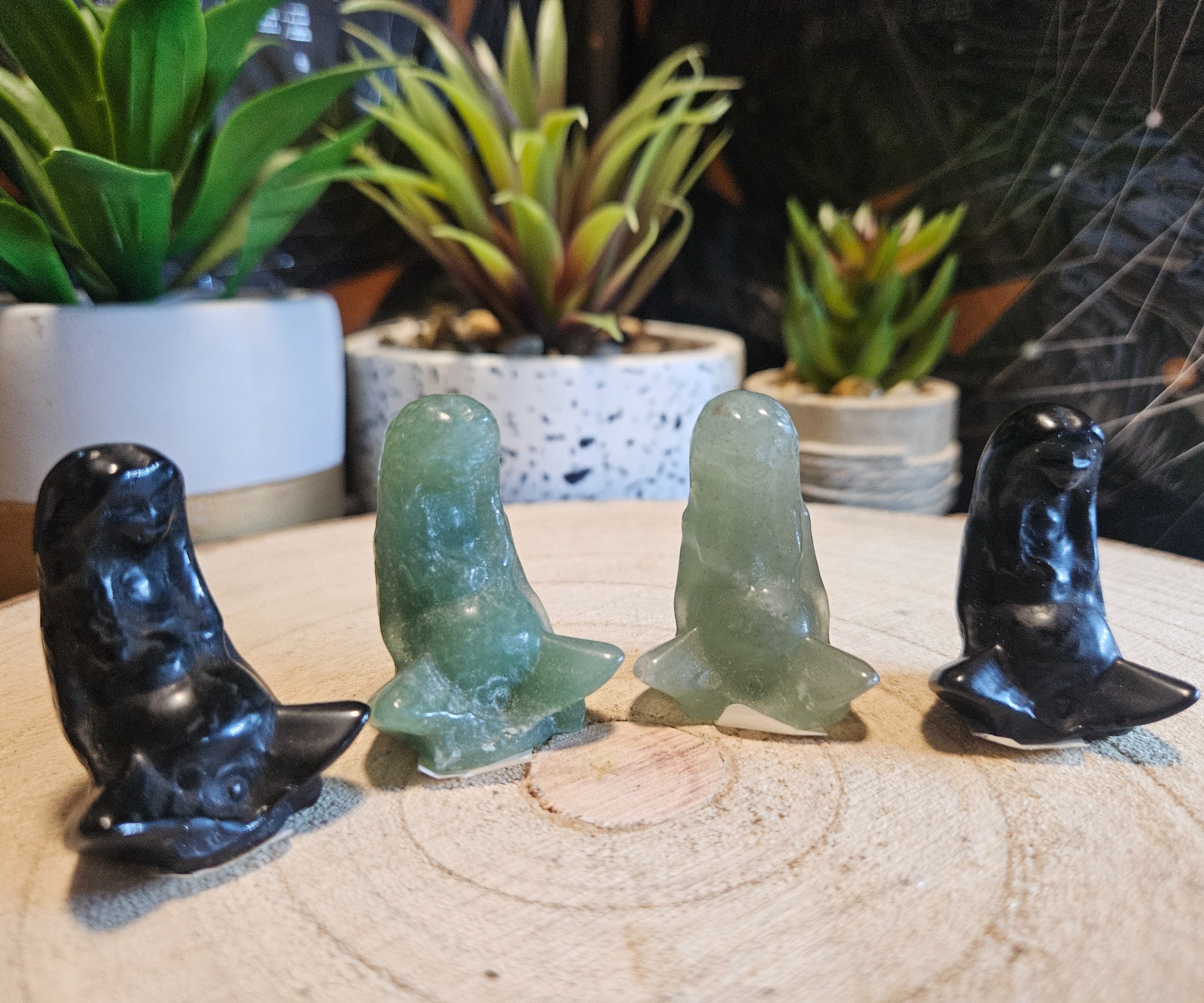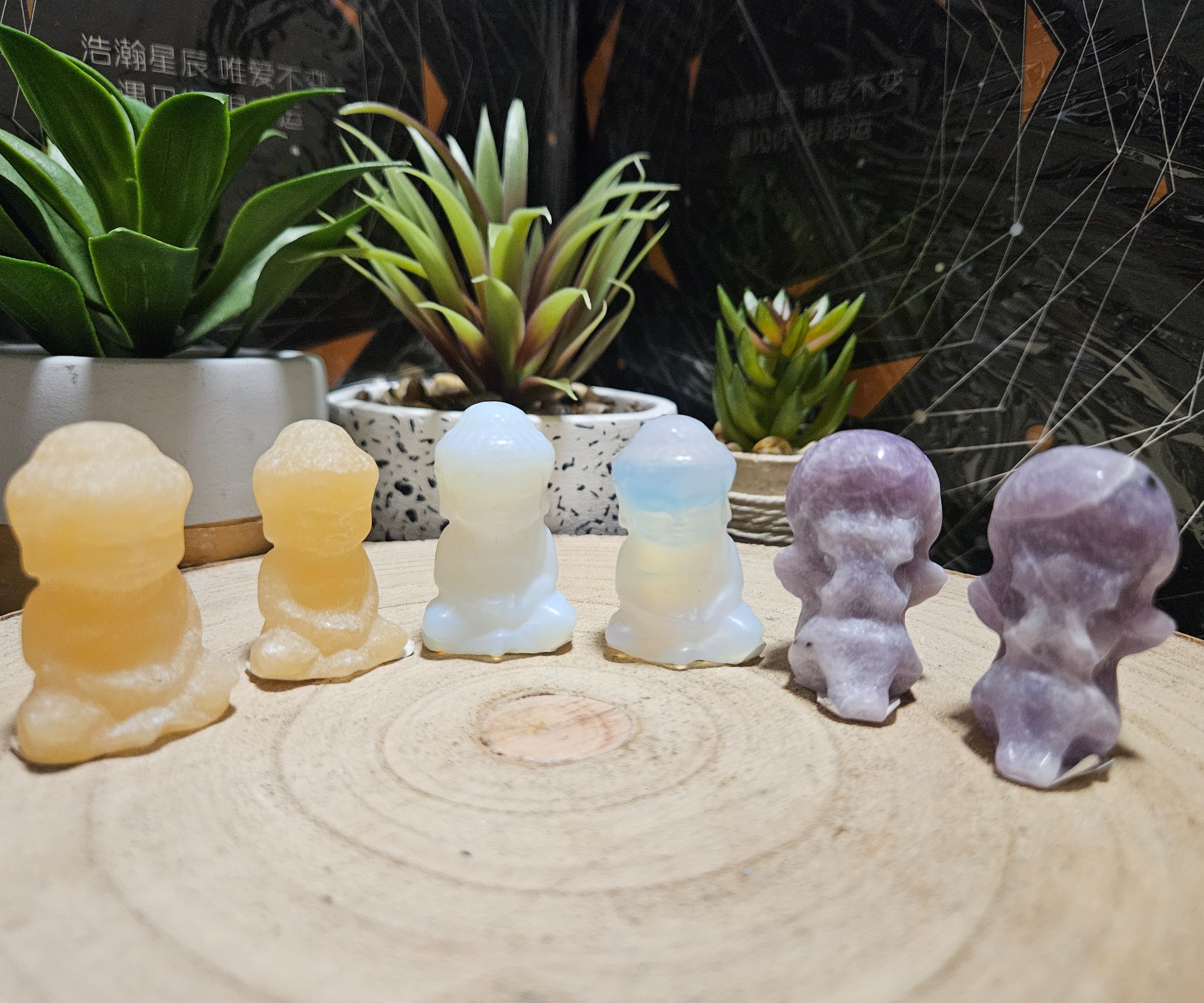 Pramatka v obsidiáne čistí Koreňovú čakru, zatiaľ čo aventurínová verzia lieči Srdcovú čakru. Buddha z oranžového kalcitu aktivuje Sakrálnu čakru pre podporu kreativity a opalitový Buddha harmonizuje čakru Tretieho oka. Anjel z lepidolitu je kameňom prechodu, ktorý vyrovnáva Korunnú čakru a prináša hlboký pokoj.