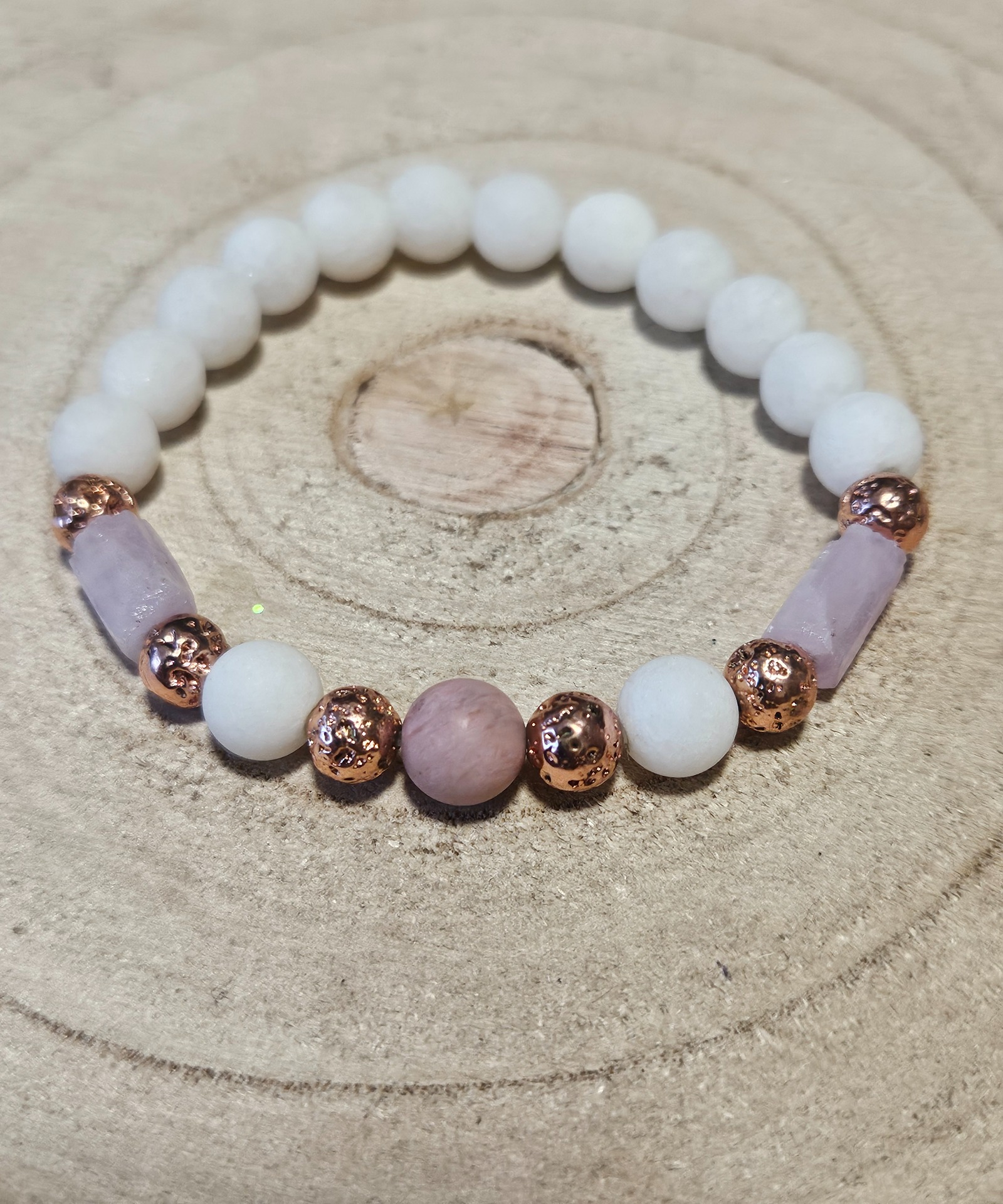 Z hľadiska zdravia pôsobí táto kombinácia ako mocný energetický regenerátor. Thulit a kunzit spoločne pôsobia na nervový systém, zmierňujú prejavy úzkosti a pomáhajú pri neurologických ťažkostiach. Biely jadeit podporuje filtráciu organizmu a rovnováhu tekutín, zatiaľ čo lávový kameň stimuluje krvný obeh. Je to ideálny šperk pre celkovú revitalizáciu tela a mysle, najmä po obdobiach veľkého citového alebo fyzického vypätia.