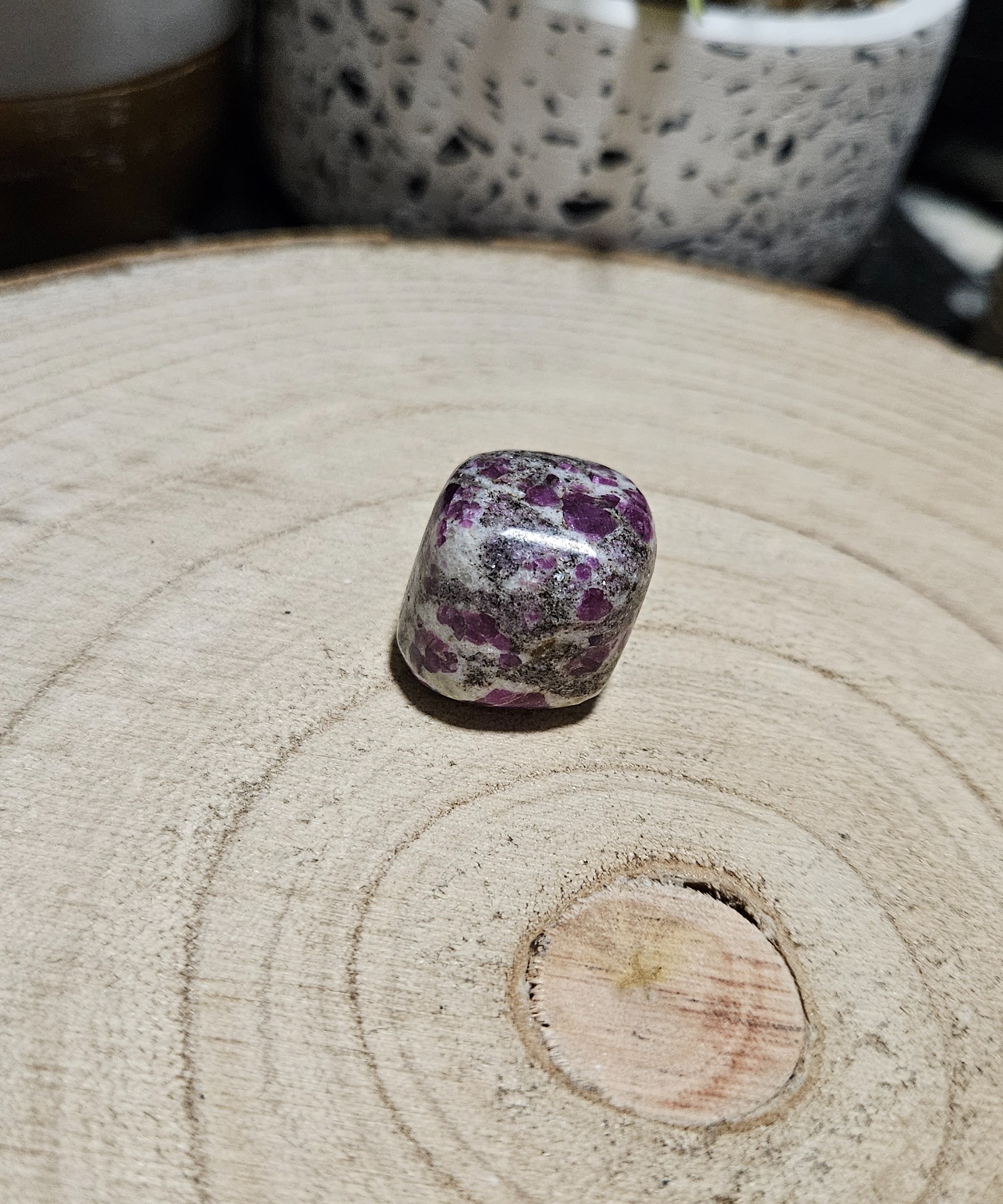 Tento starostlivo vybraný kúsok „Imperial Ruby Path” má hmotnosť 15 g a rozmer 1,9 cm. Prírodné rubínové kryštály sú pevne uchytené v minerálnej matrici živca, čo vytvára esteticky príťažlivý a odolný celok. Vďaka jemnému brúseniu vyniká prirodzená textúra oboch minerálov, pričom živec dodáva kameňu hodvábny lesk.