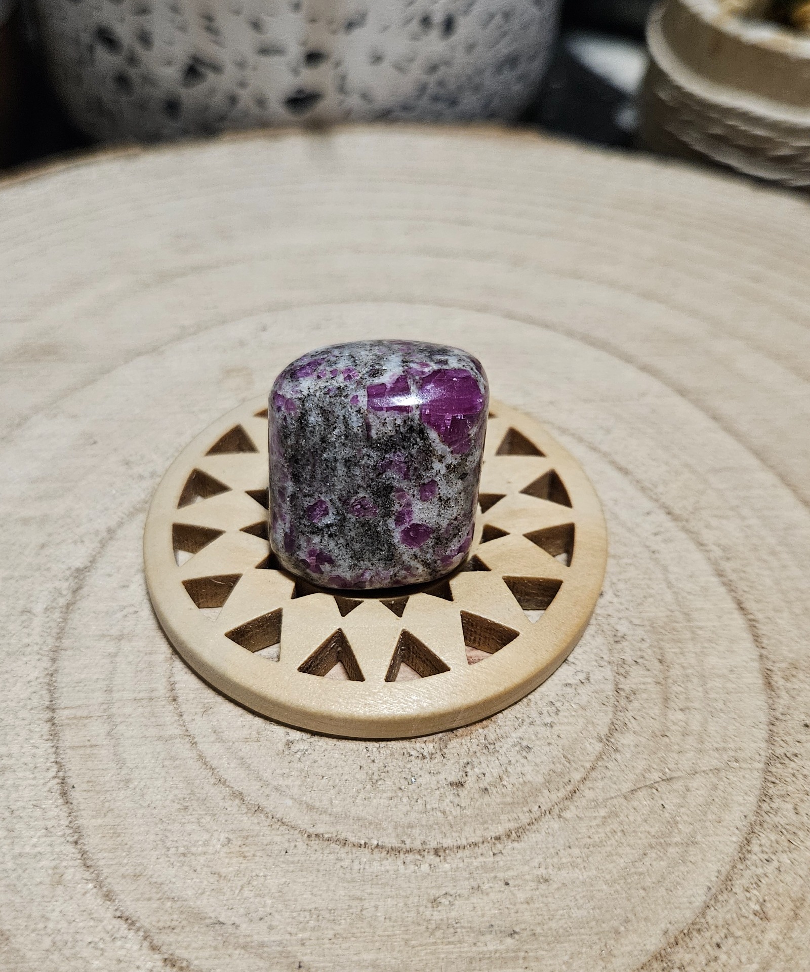 Mystika tohto 2,5 cm kameňa sa spája s vnútornou integritou a pevnou vôľou. Rubín voviazaný do živca symbolizuje vášeň, ktorá je ukotvená v rozume a trpezlivosti. Je to ideálny kameň pre lídrov a vizionárov, ktorým pomáha udržať si jasnú víziu a vytrvalosť pri dosahovaní veľkých životných cieľov.