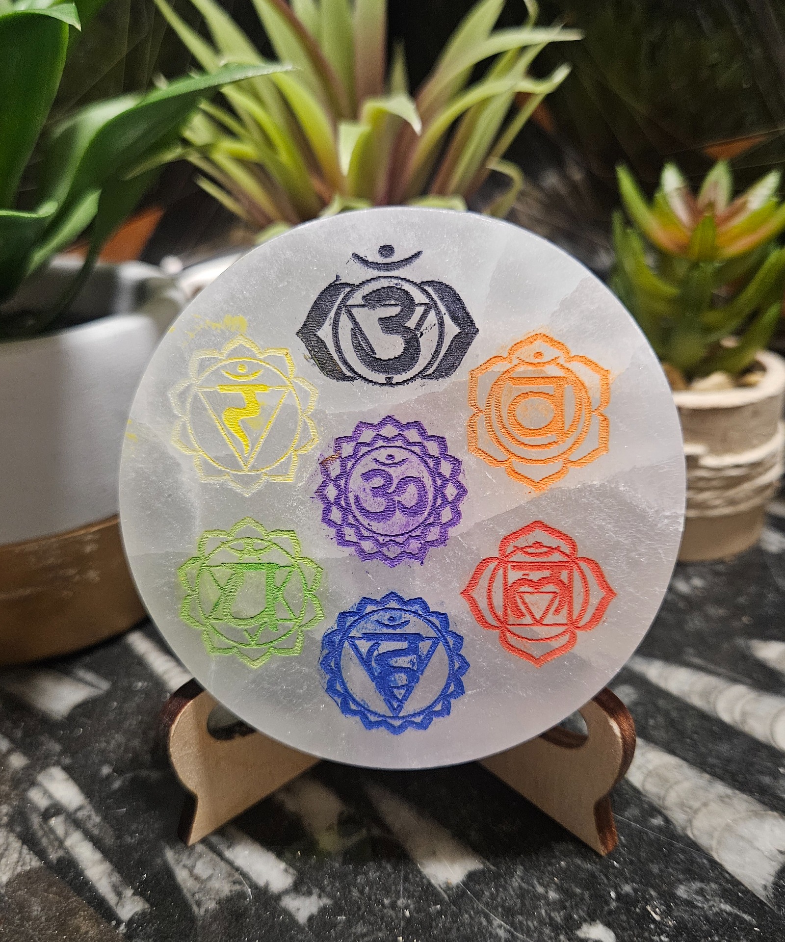 Tento kotúč priamo ovplyvňuje všetkých sedem čakier – od Koreňovej až po Korunnú. Mystika spočíva v prepojení vibrácií selenitu s frekvenciami jednotlivých farieb. Na fyzickej úrovni pomáha odbúravať únavu, zmierňovať pocity úzkosti a podporuje regeneráciu organizmu tým, že odstraňuje energetické blokády v aure.