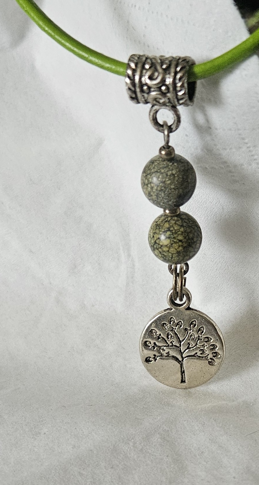 Prepojte sa s energiou prírody prostredníctvom tohto unikátneho handmade náhrdelníka z línie Imperial. Dominantou sú dve jemne opracované korálky z minerálov Serpentínu, ktoré dopĺňa detailne spracovaný prívesok Stromu života. Celý medailón s dĺžkou približne 5,5 cm visí na štýlovej zelenej šnúrke s koženým vzhľadom, ktorá podčiarkuje jeho naturálny charakter. Keďže ide o originálnu ručnú prácu, zasielame vám presne ten kus, ktorý vidíte na fotografii.
