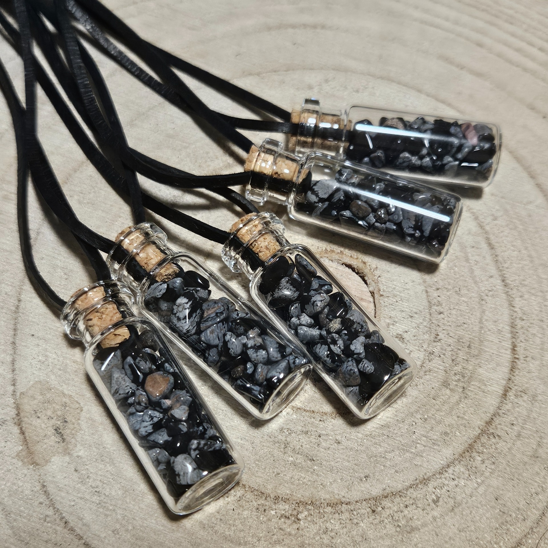 V mágii sa vločkový obsidián považuje za kameň „čistoty“, ktorý vnáša rovnováhu do mysle i tela. Táto magická fľaštička (spell jar) slúži čarodejniciam ako nástroj na upokojenie rozvírených emócií a uvoľnenie starých myšlienkových vzorcov. Nosenie tohto amuletu pomáha počas rituálov zostať v spojení s realitou, zatiaľ čo biele „vločky“ vo vnútri symbolizujú svetlo nádeje v temných časoch. Je to ideálny spoločník pre tie, ktoré hľadajú cestu k sebapoznaniu bez strachu z vlastných tieňov.