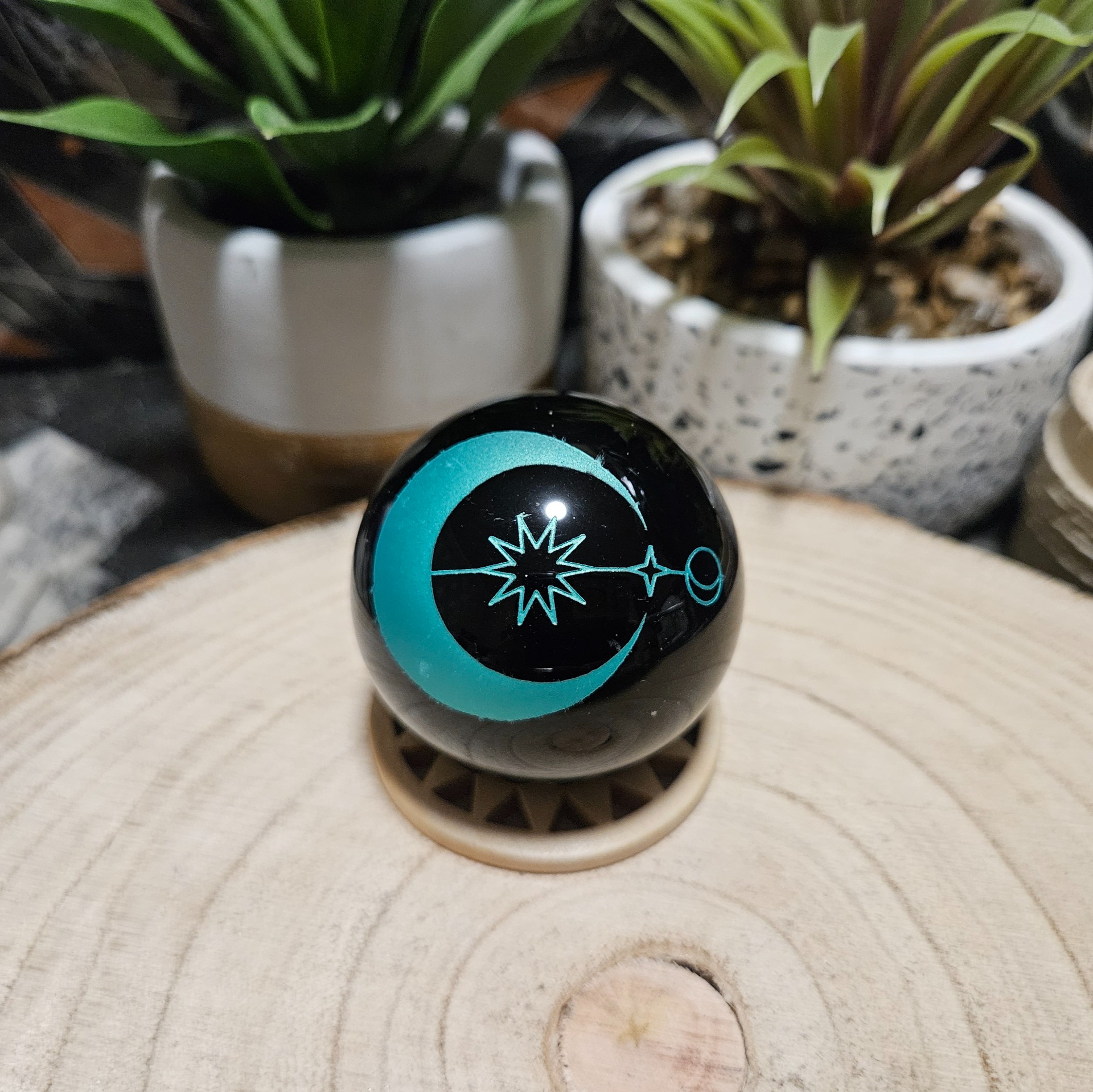 V modernej mágii je táto guľa považovaná za silný „spirituálny kompas“. Zelený symbol Mesiaca na čiernom obsidiáne sa používa pri rituáloch spojených s dorastajúcim mesiacom na pritiahnutie hojnosti a uzdravenie srdca. Je to ideálny nástroj na veštenie (tzv. scrying), kde čierny reflexný povrch pomáha nahliadnuť do nevedomia, zatiaľ čo zelené symboly chránia čarodejnicu pred energetickým vyčerpaním.