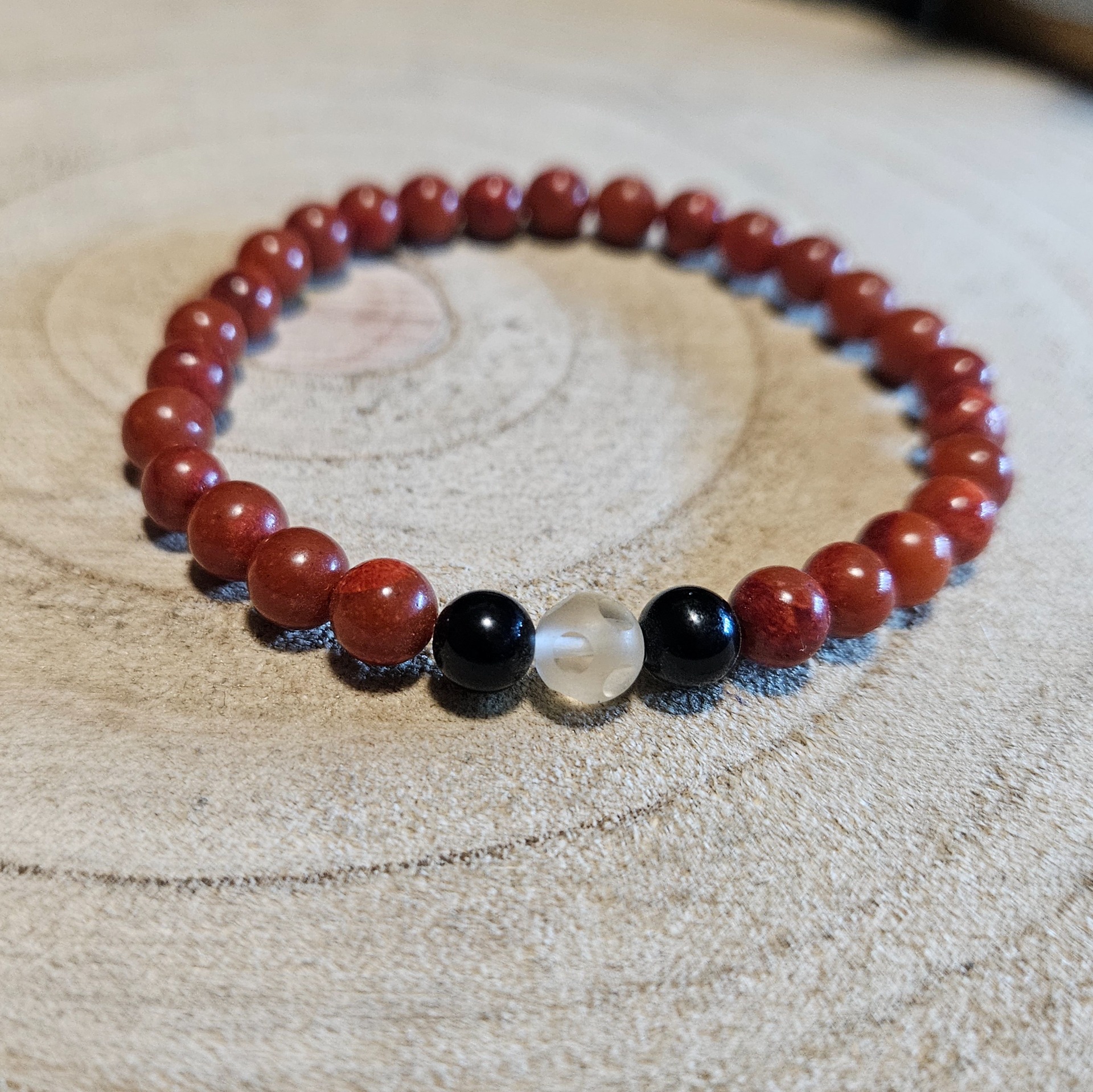 Z magického hľadiska je tento náramok dokonalým nástrojom na ochranu a manifestáciu. Jaspis pomáha tvojim plánom stáť na pevných základoch, obsidián pohlcuje environmentálne škodliviny a krištáľ zameriava tvoju vôľu. Nos ho počas rituálov, keď potrebuješ koncentráciu, alebo ho maj pri sebe, aby si si zachoval svoje osobné hranice voči vonkajšiemu svetu.