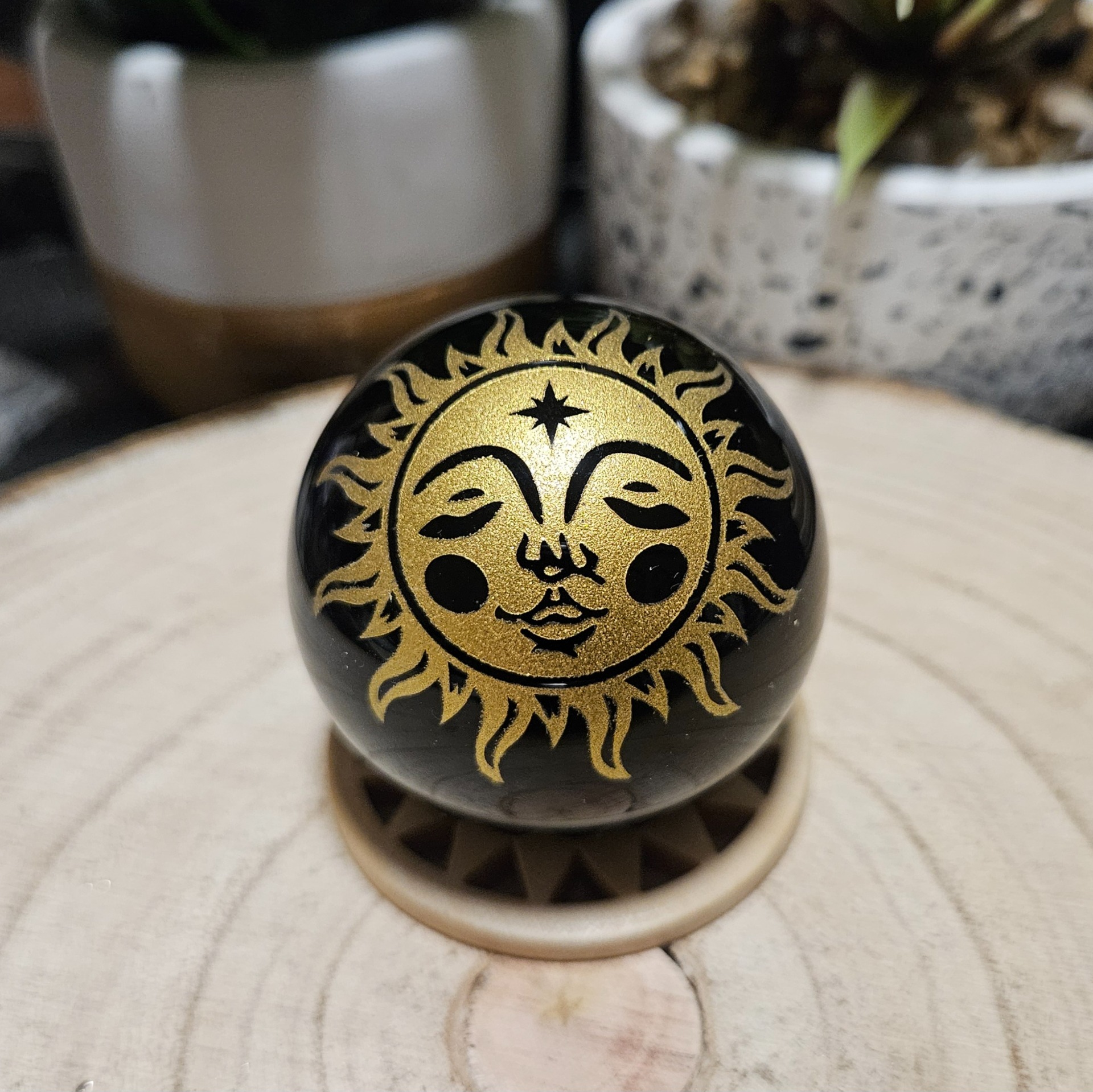 Imperial Zlaté Slnko Obsidián – Sféra vnútorného svetla (Prírodná čierna obsidiánová guľa s gravírovaným zlatým symbolom Slnka – priemer 5 cm)