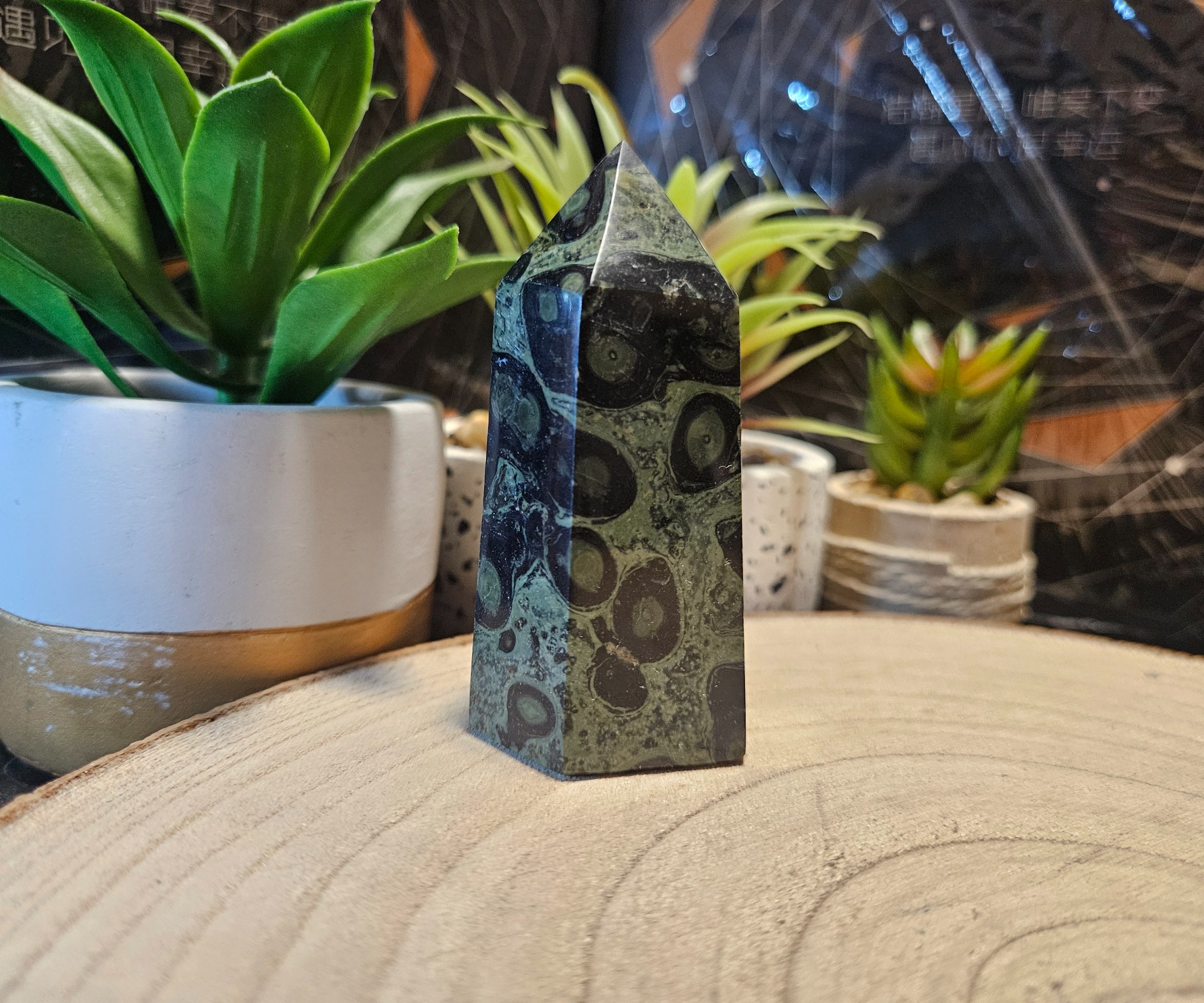 Kambaba jaspis je špeciálny kameň, často označovaný akokameň pokoja a mieru. Je to vzácny druh jaspisu, ktorý pochádza z nálezísk naMadagaskare a v Južnej Afrike. Jeho zelené a čierne vzory sú veľmicharakteristické a niekedy vytvárajú kruhové „oká” alebo vírivé tvary, preto saniekedy nazýva aj krokodílí jaspis alebo zelený stromatolitový jaspis. Jezaujímavé, že hoci má v názve slovo „jaspis”, geologicky je to vlastne typryolitu, ktorý obsahuje starobylé fosílne riasy (stromatolity) staré viac ako 3miliardy rokov, čo z neho robí jeden z najstarších kameňov na planéte.