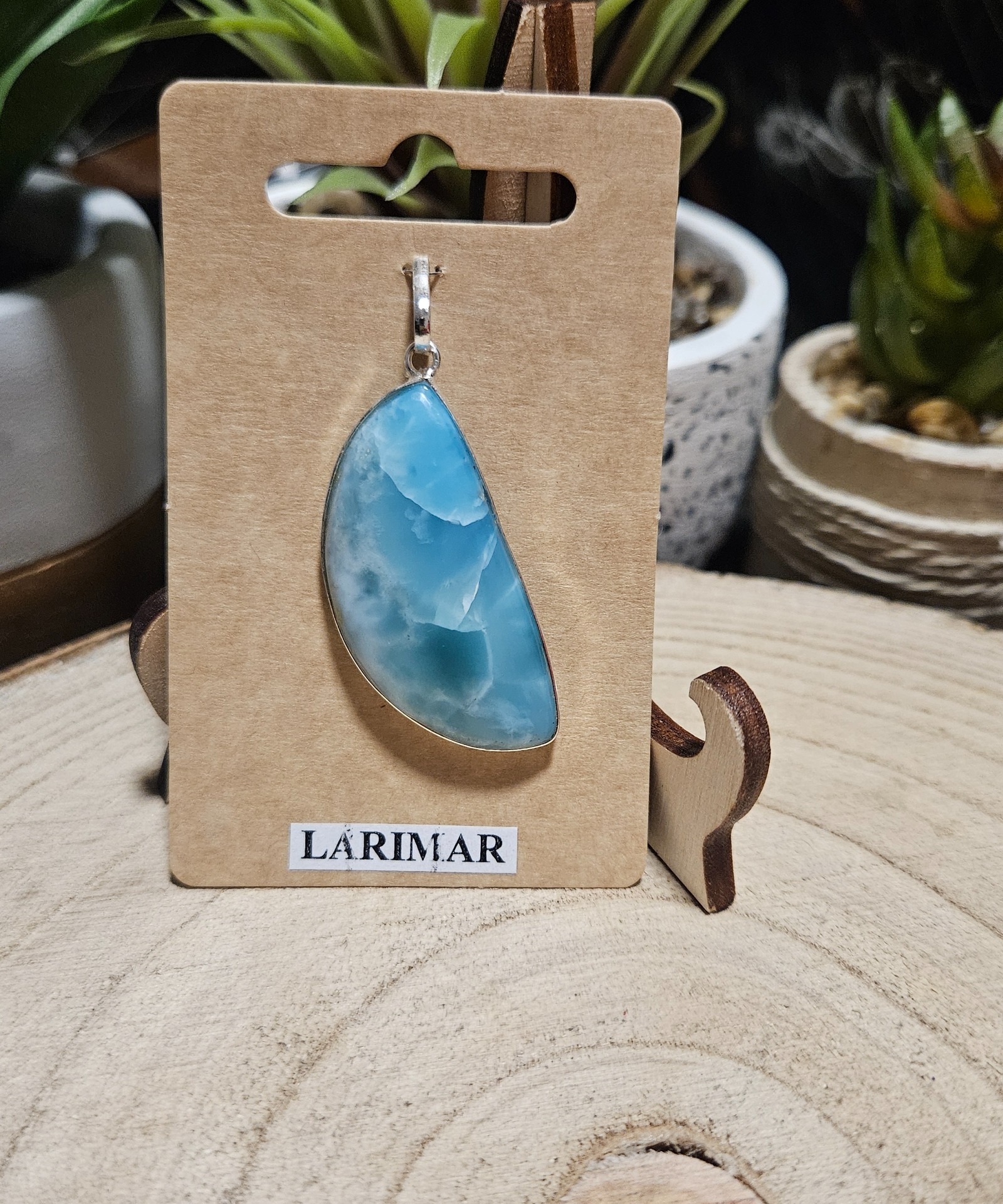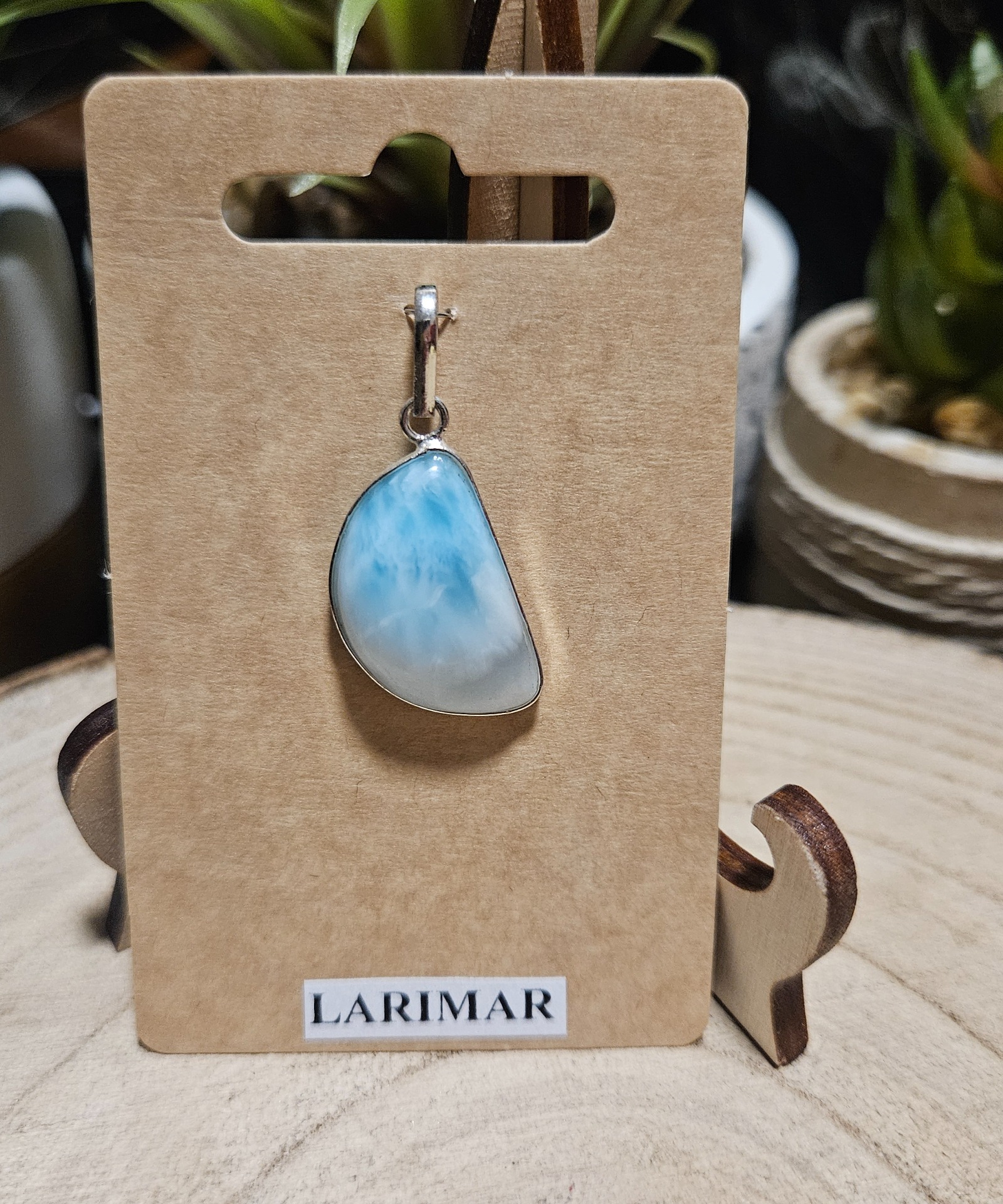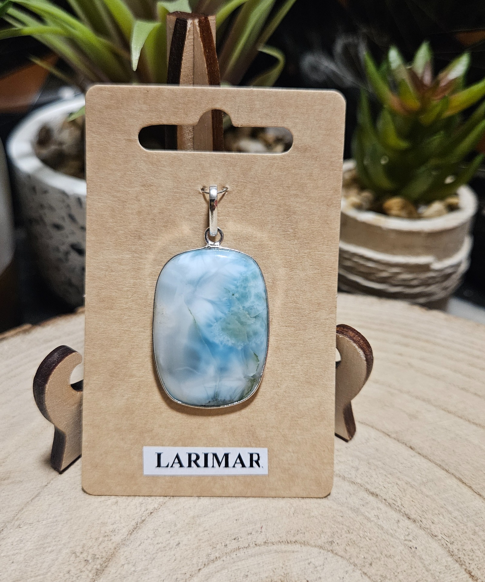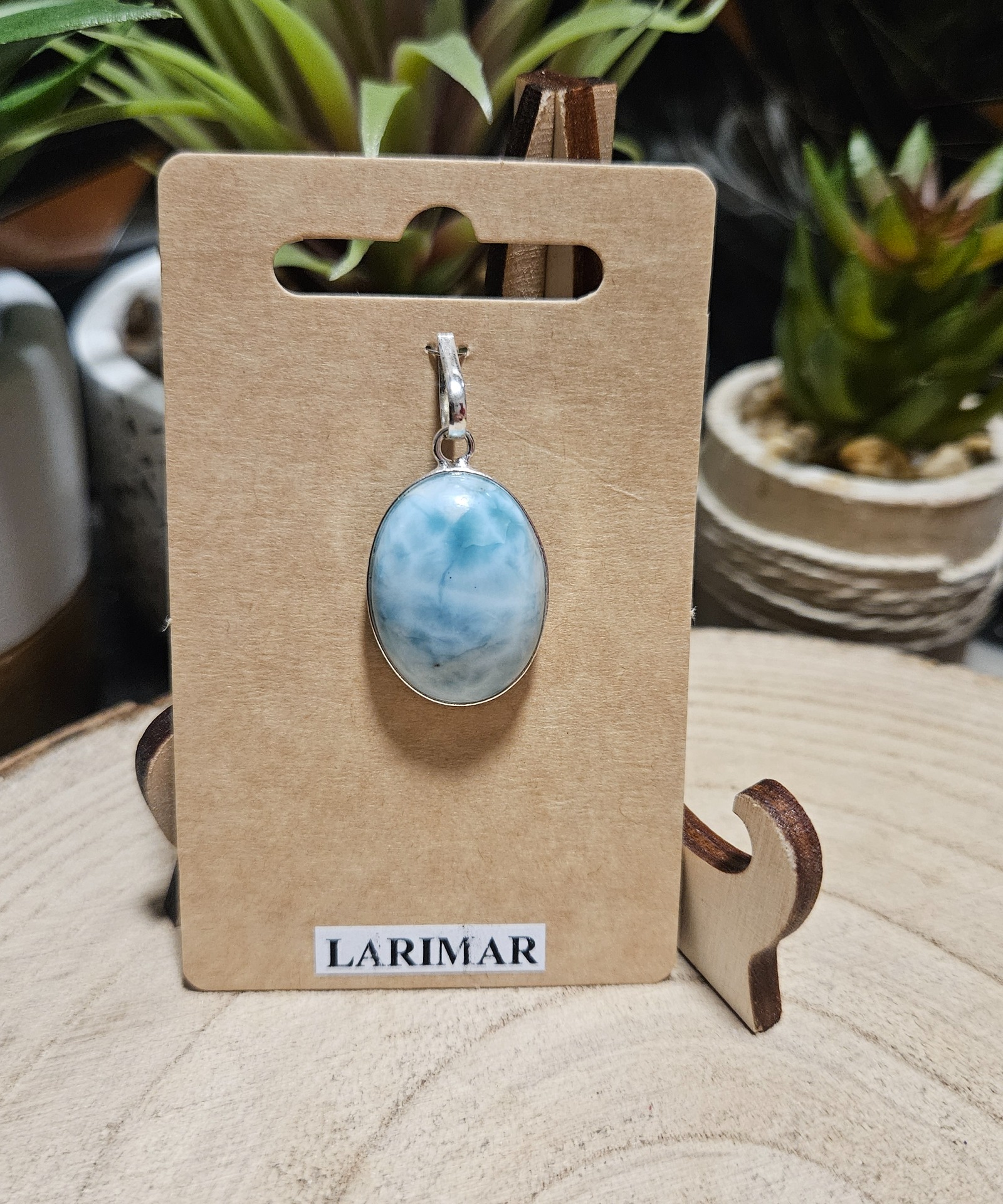 Tento Larimarový prívesok je stelesnením jedinečnosti a pokojovosti. Úžasná modrá a biela farba kameňa evokuje stretnutie Karibského mora a oblohy, pričom každý kus sa líši tvarom – či už ide o ovál, kvapku, obdĺžnik alebo polmesiac. Nos ho v blízkosti Hrdla, aby posilnil tvoje úprimné sebavyjadrenie a zmiernil každodenný stres. Postriebrené osadenie dodáva tomuto vzácnemu minerálu extra eleganciu.