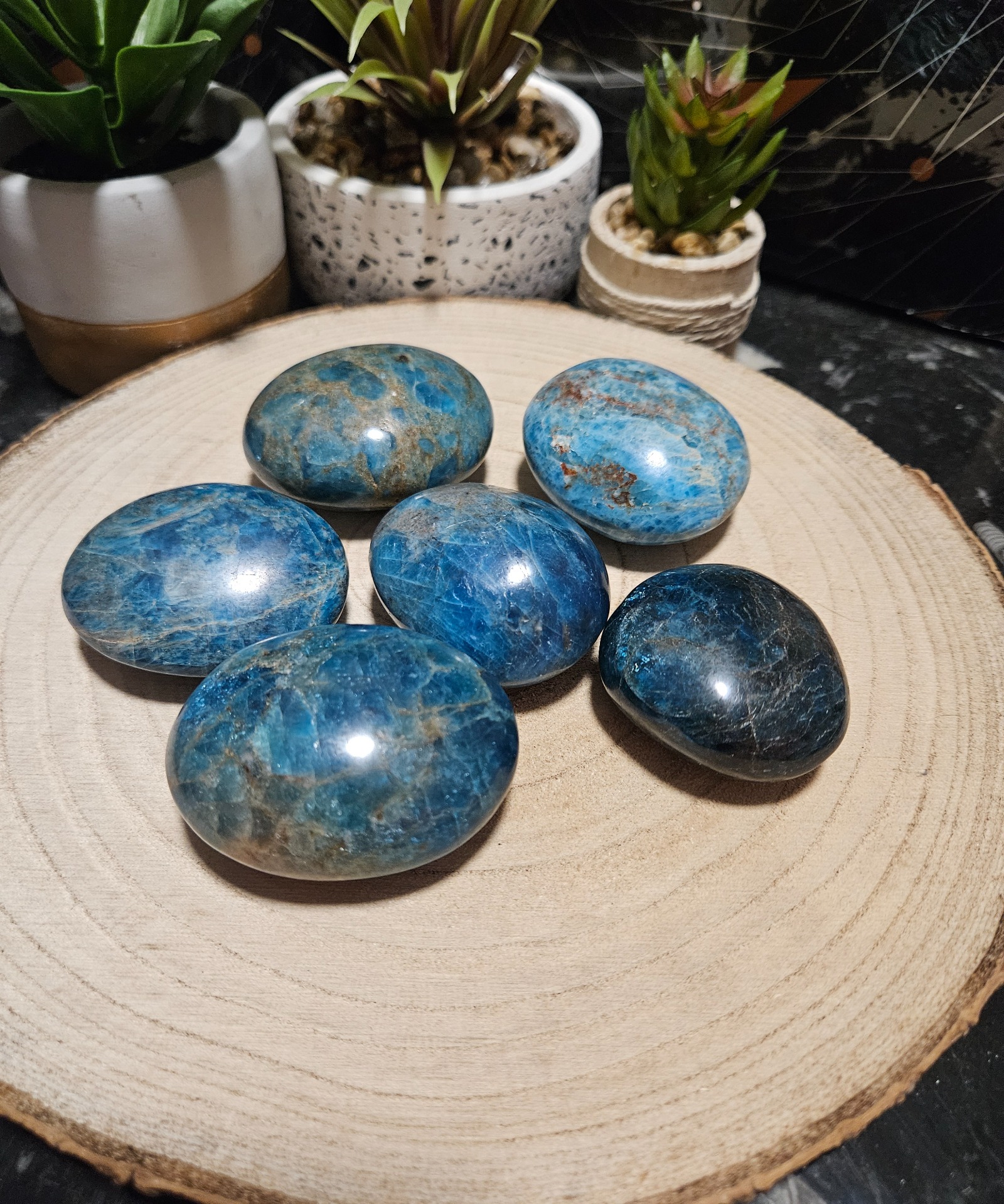 Tento extra veľký Modrý Apatitový Hladený Kameň je skutočný palmový kameň (palm stone). Veľký, hladký, leštený kus meria 5-6 cm, čo zaisťuje optimálny komfort pri držaní v ruke. Živá, tmavomodrá farba a prirodzené žilkovanie kameňa predstavujú dokonalú rovnováhu duchovného pokoja a mentálnej bdelosti.