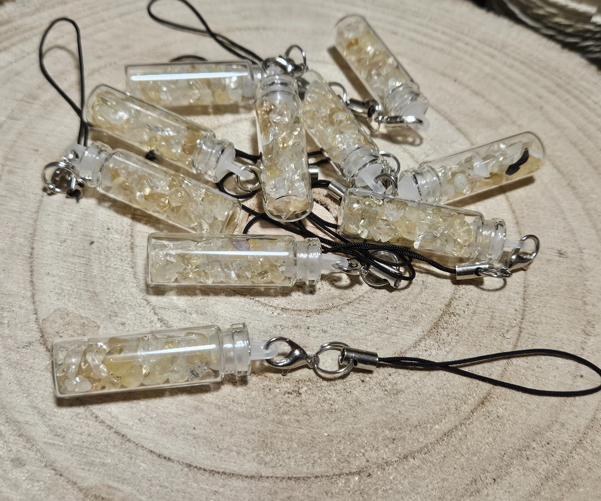Pripravte sa na manifestáciu hojnosti! Táto pekná, malá skúmavka s citrínovými štiepkami je koncentrovaný zdroj energie, ideálny ako kľúčenka alebo prívesok na tašku. Namiesto nosenia veľkého kusu sa tu spájajú malé, silné kúsky Citrínu v skúmavke, aby dosiahli najväčší účinok na najmenšom priestore.