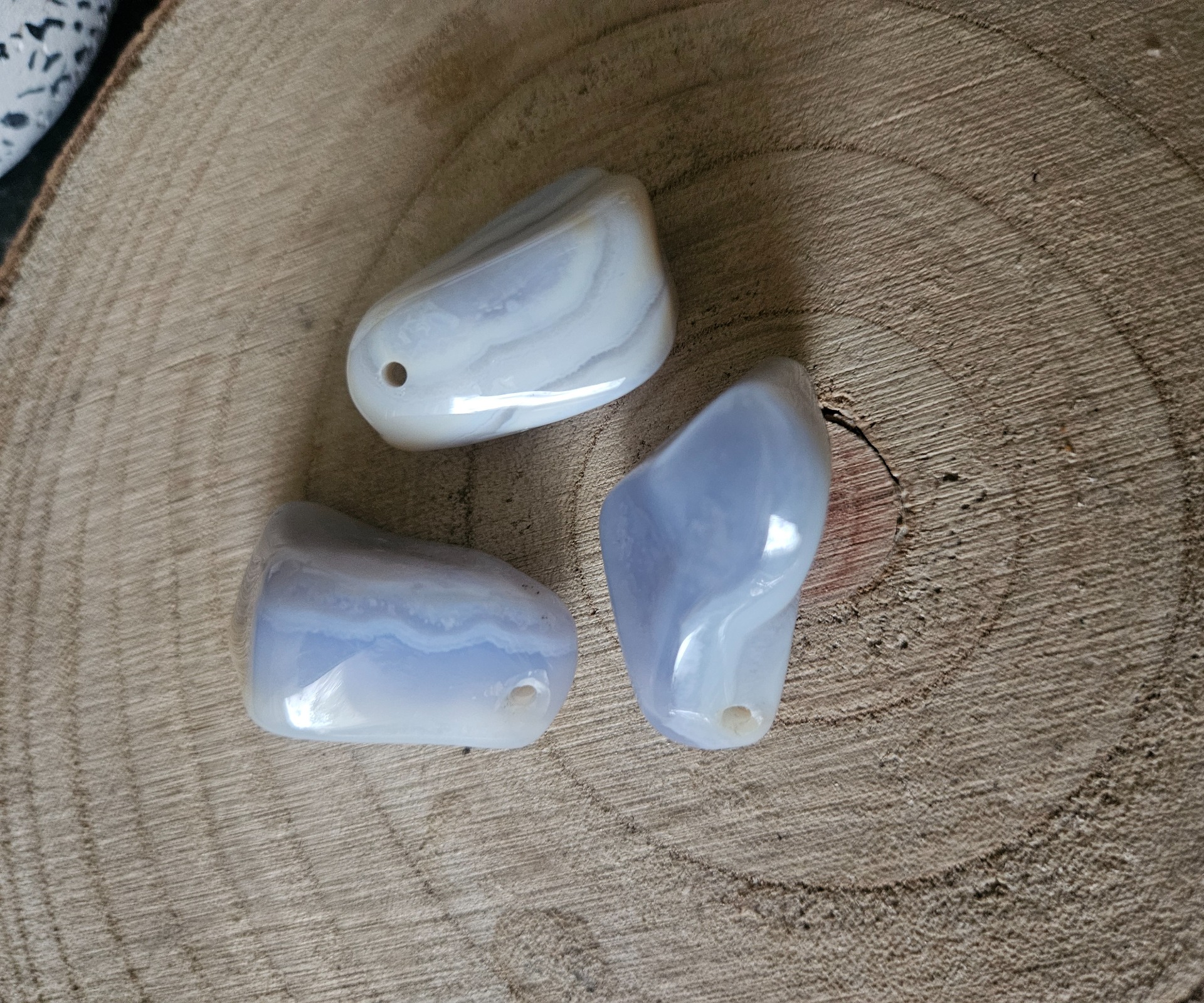 Tento 3,5 cm leštený prívesok Modrý Chalcedón je viac než len šperk. Jeho tvar a jemný, priesvitný modrosivý odtieň pripomínajú dokonale vyleštený riečny kamienok, ktorý prináša nositeľovi hlboký vnútorný pokoj.