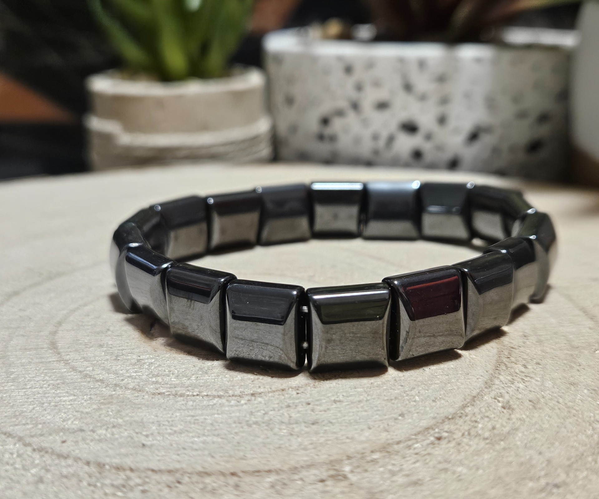 Tento XL Magnetický Hematitový Náramok je elegantný, no zároveň odhodlaný kúsok, ktorý kombinuje ochrannú silu minerálu s uznávanými účinkami magnetickej terapie. Náramok je zložený z plochých, mierne zaoblených obdĺžnikových/tyčinkových korálok, ktoré merajú 1,7 cm (17 mm). Táto veľkosť ponúka dokonalý kompromis medzi robustným, mužným štýlom a pohodlným nosením.