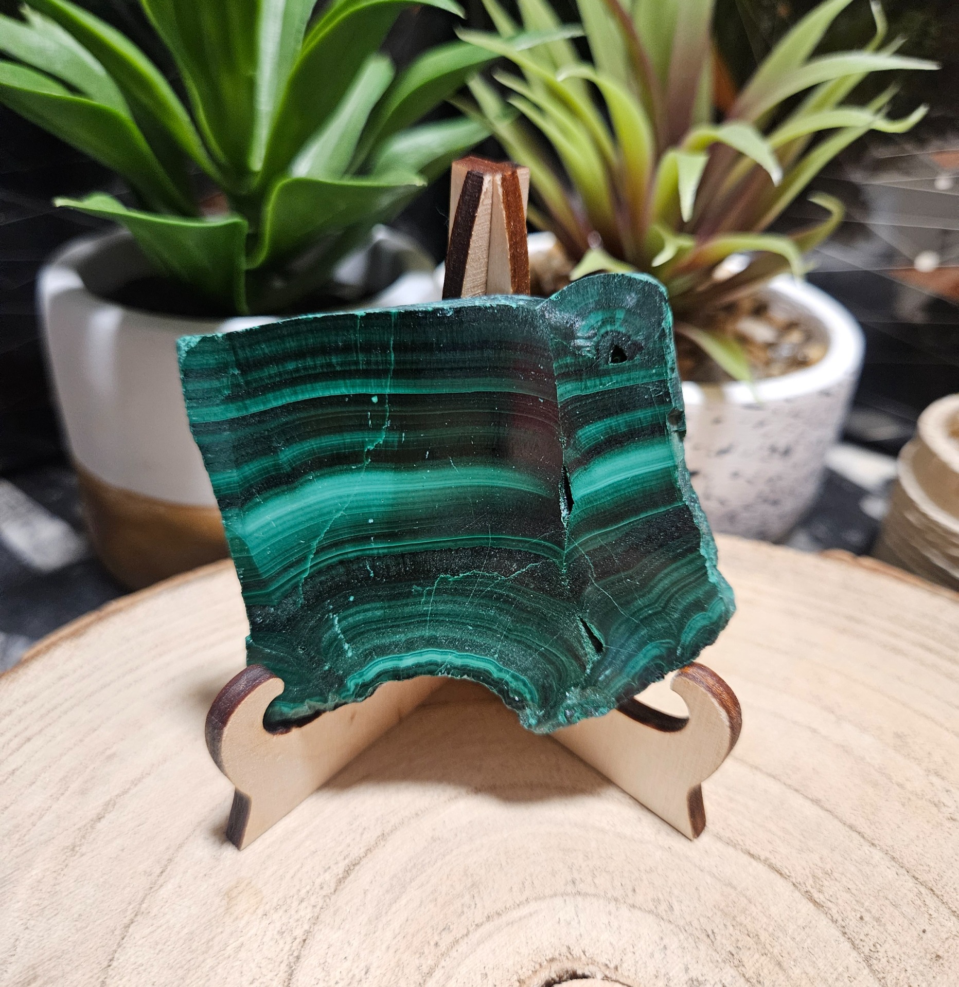 Leštený, ohladený rez kvapľom malachitu s veľmi peknou avýraznou kresbou, ohladený z oboch strán s jemným leskom.
