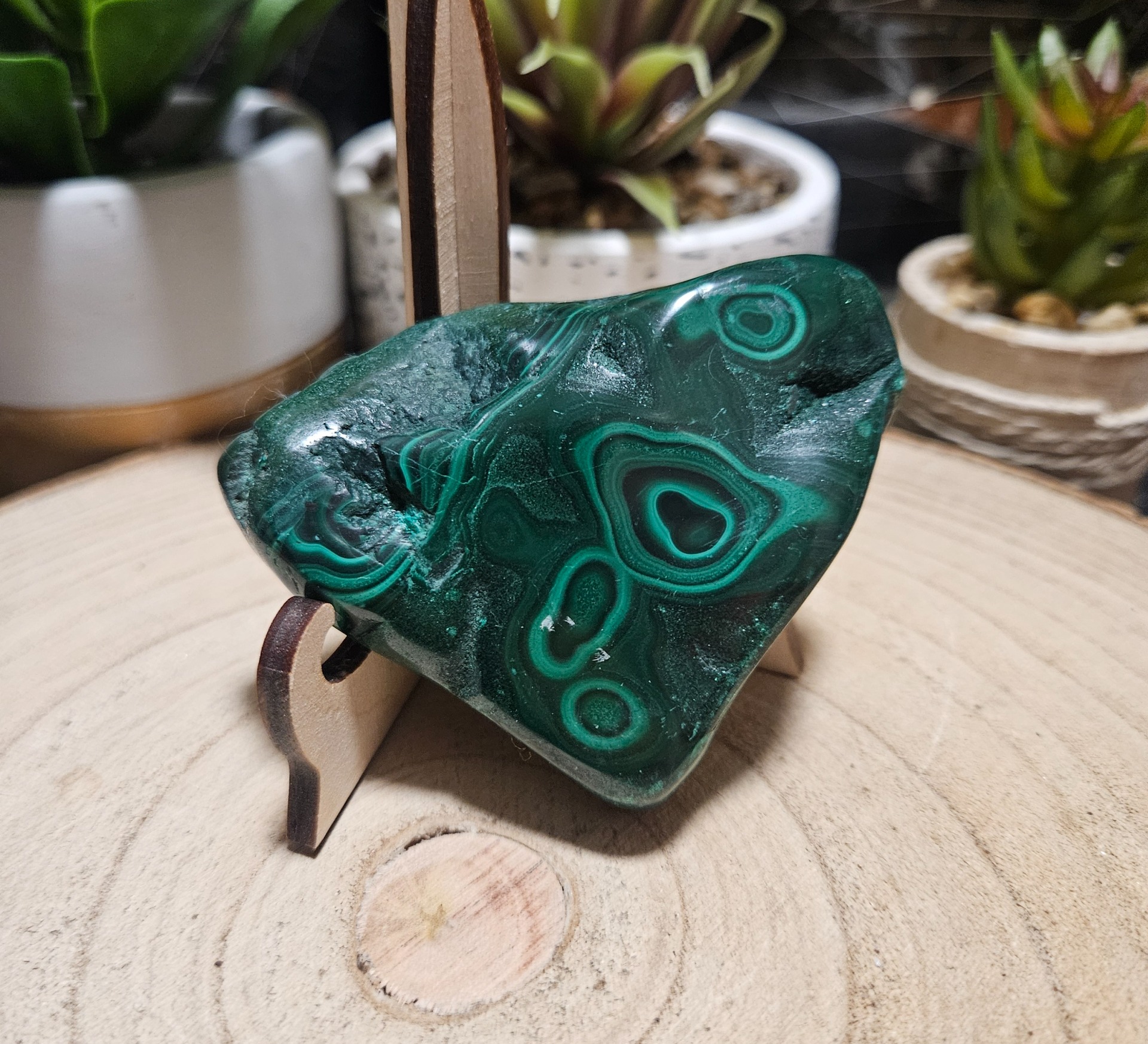 Leštený, ohladený rez kvapľom malachitu s veľmi peknou avýraznou kresbou, ohladený z oboch strán s jemným leskom.