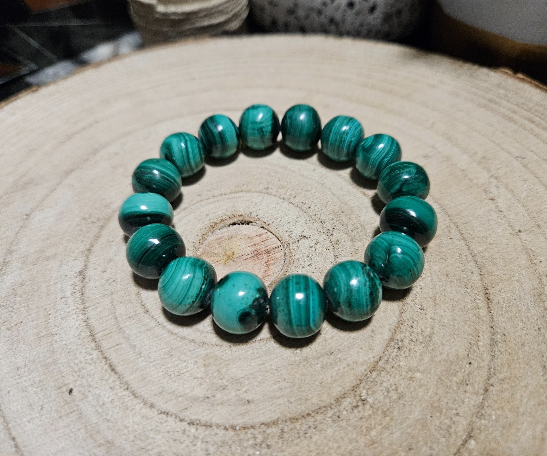 Krásny výrazný náramok z korálikov prírodného malachitu vextra AA kvalite. Elegantný náramok, vhodný na rôzne príležitosti, ktorý másvoju výraznú kresbu kameňa. Veľkosť korálikov malachitu cca 12mm,navlečené na kvalitnej nylonovej gumičke neutrálnej farby.