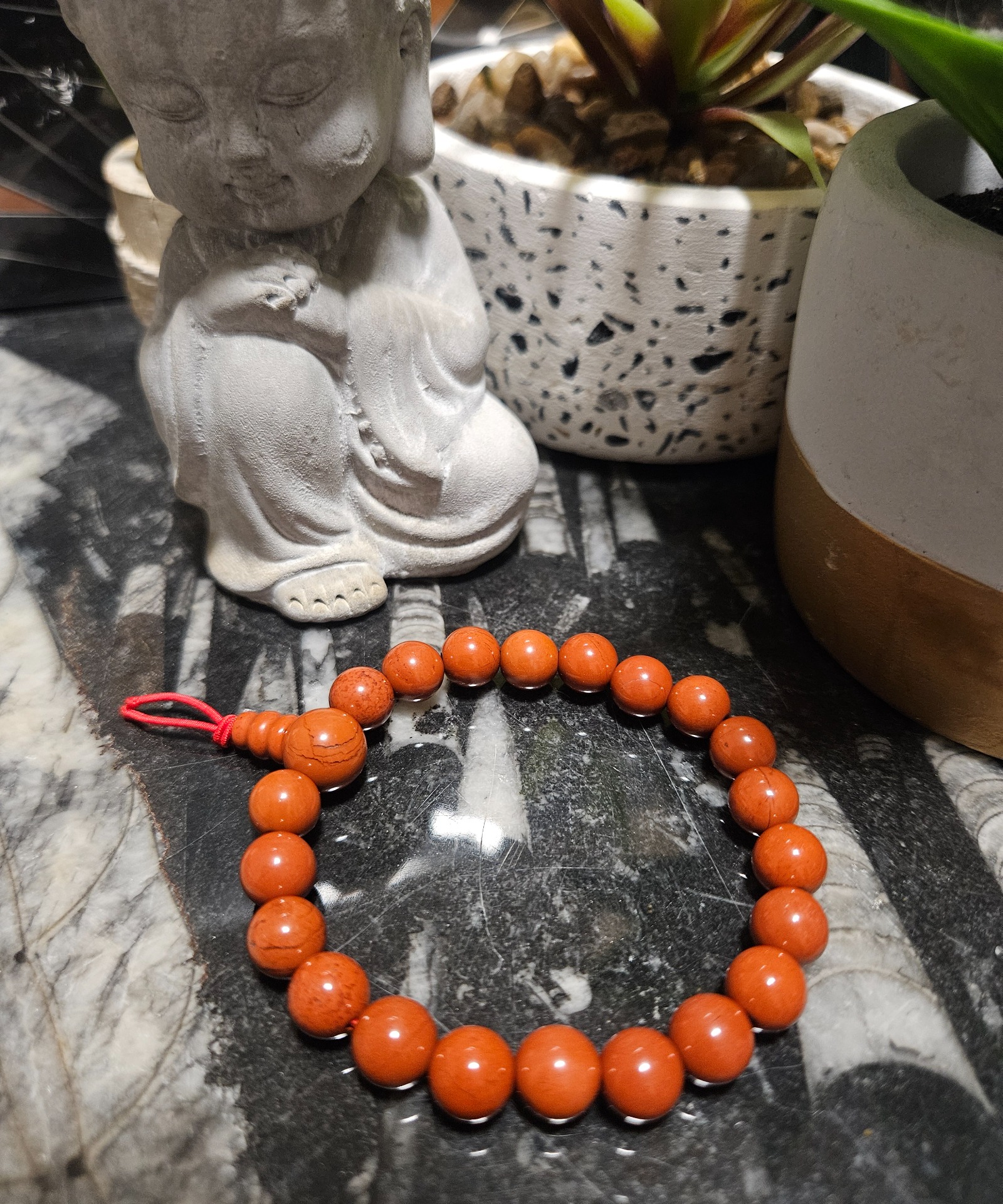 Tento starostlivo vyrobený náramok z červeného jaspisu Buddha nie je len šperkom, ale aj duchovným pomocníkom pre každodenný život. Hladké, 8 mm korálky a väčšia, 10 mm guru korálka tvoria harmonický celok, ktorý odkazuje na tradíciu meditačných mál. Noste tento náramok, aby ste si vždy pripomínali svoj vnútorný pokoj a cítili upokojujúcu, uzemňujúcu silu červeného jaspisu.