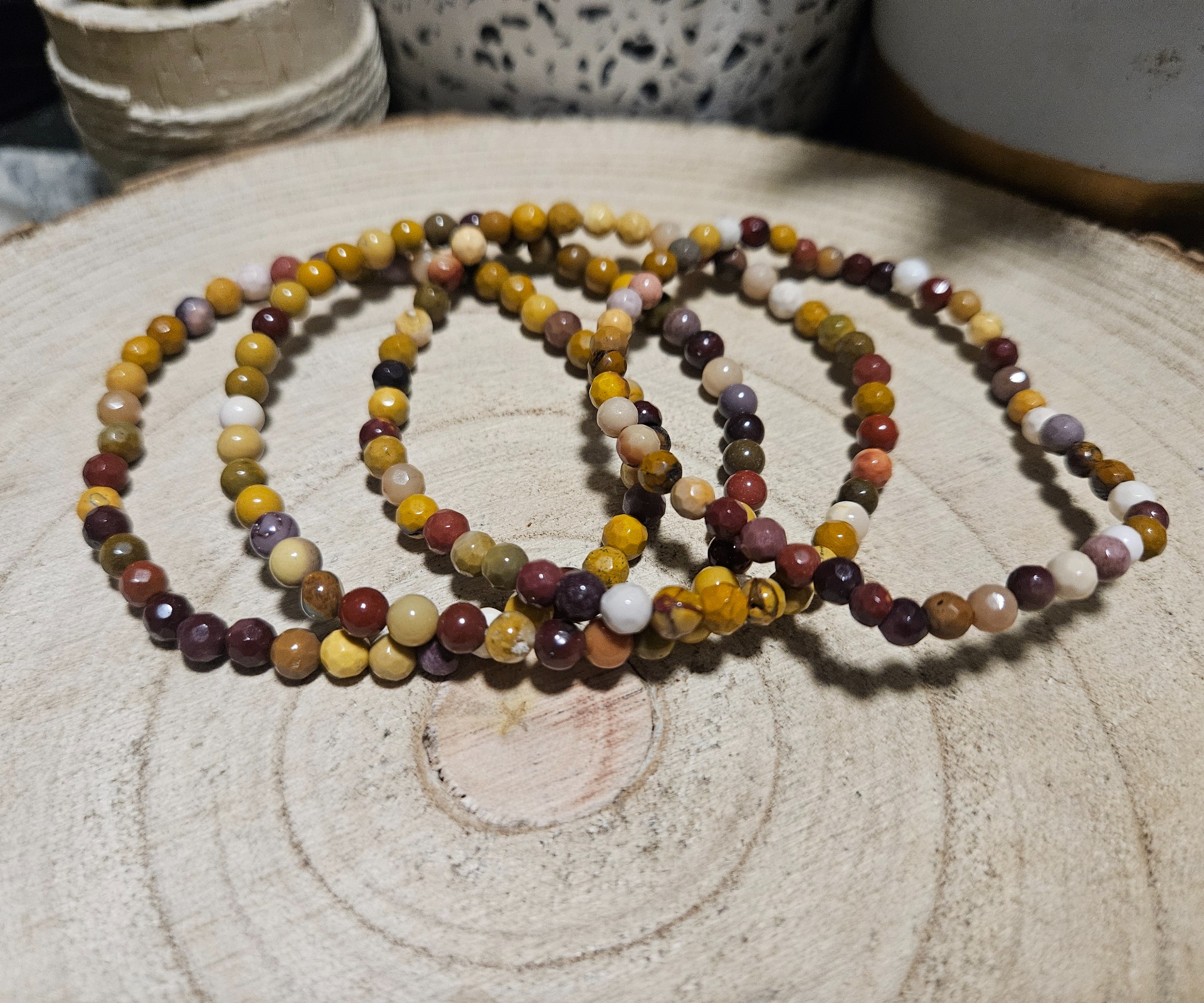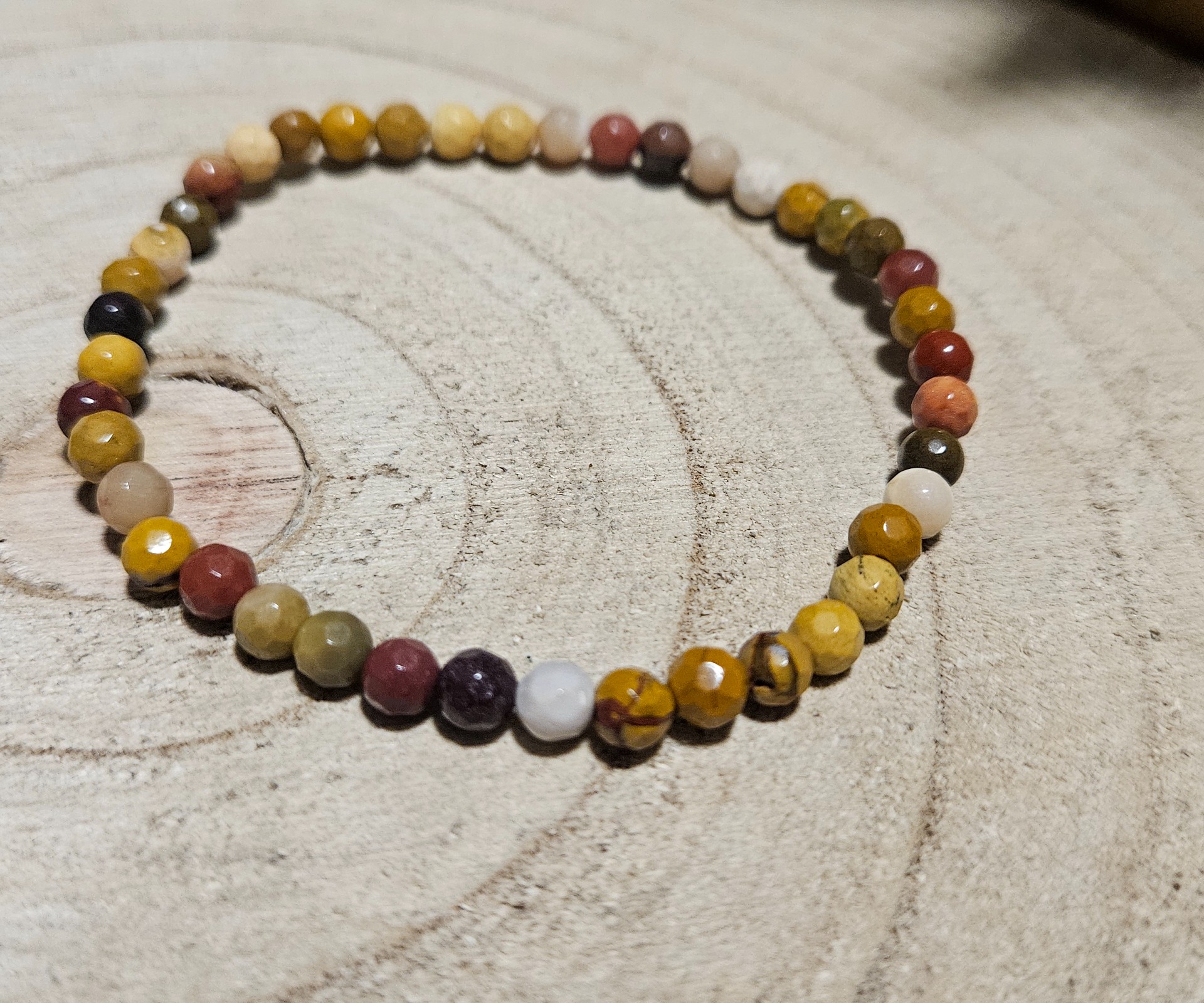 ​Tento náramok z fazetovaných 4 mm korálok Mookait jaspisu spája živé farby kameňa s jedinečnou eleganciou. Drobné rezy (fazety) na povrchu malých korálok jemne odrážajú svetlo pri každom pohybe, čím zdôrazňujú bohatstvo odtieňov červenej, žltej a fialovej. Navlečený na pružnej gumovej šnúrke je tento náramok pohodlný na nosenie, neustále vás inšpiruje a podporuje.