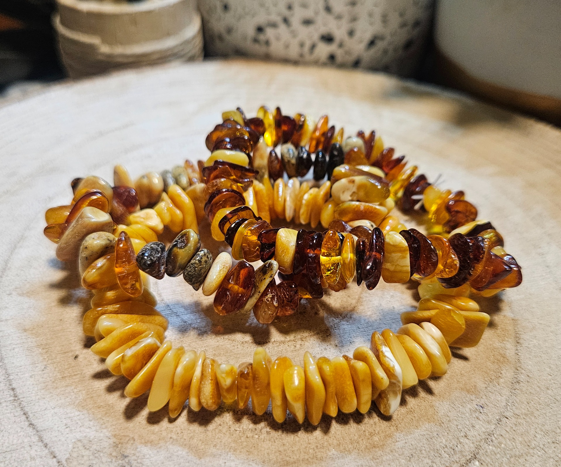 Tento náramok z jantárového maxi splitteru v sebe nesie prirodzenú silu a teplo jantáru. Leštené, no napriek tomu prírodne tvarované kúsky jantáru dodávajú náramku žiarivú, jedinečnú textúru. Navlečený na elastickú gumičku, náramok sa pohodlne prispôsobí veľkosti zápästia 16-18 cm, čo ho robí ideálnym na každodenné nosenie. Jantár je tradične považovaný za kameň, ktorý vyžaruje upokojujúcu energiu, zmierňuje stres a rozjasňuje dušu. Keďže je každý kus jedinečný, náramok sa posiela na základe náhodného výberu.