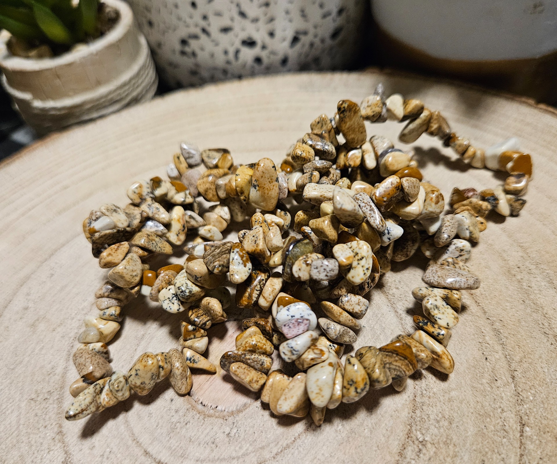 Tento náramok z jaspisu Kalahari, vyrobený z úlomkov, oslavuje nedotknutú krásu prírody. Starostlivo brúsené, no nepravidelné kamienky vytvárajú jedinečný, organický vzor, ktorý evokuje nekonečné krajiny púšte Kalahari. Pohodlné nosenie na pružnej šnúrke pomáha cítiť silu tohto prírodného minerálu každý deň.